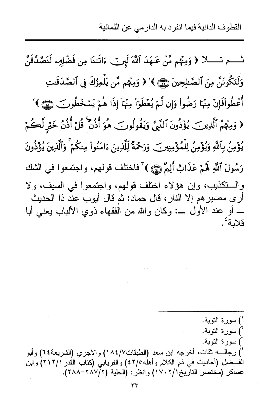 ثم تلا {وَمِنْهُمْ مَنْ عَاهَدَ اللَّهَ لَئِنْ آتَانَا مِنْ فَضْلِهِ لَنَصَّدَّقَنَّ وَلَنَكُونَنَّ مِنَ الصَّالِحِينَ} (¬1) {وَمِنْهُمْ مَنْ يَلْمِزُكَ فِي الصَّدَقَاتِ فَإِنْ أُعْطُوا مِنْهَا رَضُوا وَإِنْ لَمْ يُعْطَوْا مِنْهَا إِذَا هُمْ يَسْخَطُونَ} (¬2)، {وَمِنْهُمُ الَّذِينَ يُؤْذُونَ النَّبِيَّ وَيَقُولُونَ هُوَ أُذُنٌ قُلْ أُذُنُ خَيْرٍ لَكُمْ يُؤْمِنُ بِاللَّهِ وَيُؤْمِنُ لِلْمُؤْمِنِينَ وَرَحْمَةٌ لِلَّذِينَ آمَنُوا مِنْكُمْ وَالَّذِينَ يُؤْذُونَ رَسُولَ اللَّهِ لَهُمْ عَذَابٌ أَلِيمٌ} (¬3) فاختلف قولهم، واجتمعوا في الشك والتكذيب، وإن هؤلاء اختلف قولهم، واجتمعوا في السيف، ولا أرى مصيرهم إلا النار، قال حماد: ثم قال أيوب عند ذا الحديث - أو عند الأول -: وكان والله من الفقهاء ذوي الألباب يعني أبا قلابة (¬4).