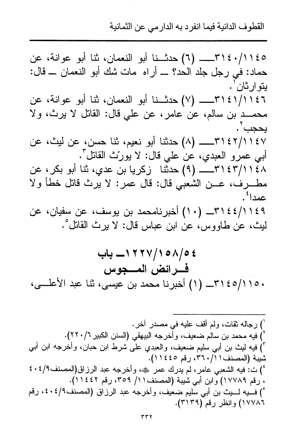 1149/ 3144 - (10) أخبرنامحمد بن يوسف، عن سفيان، عن ليث، عن طاووس، عن ابن عباس قال: لا يرث القاتل (¬5).
