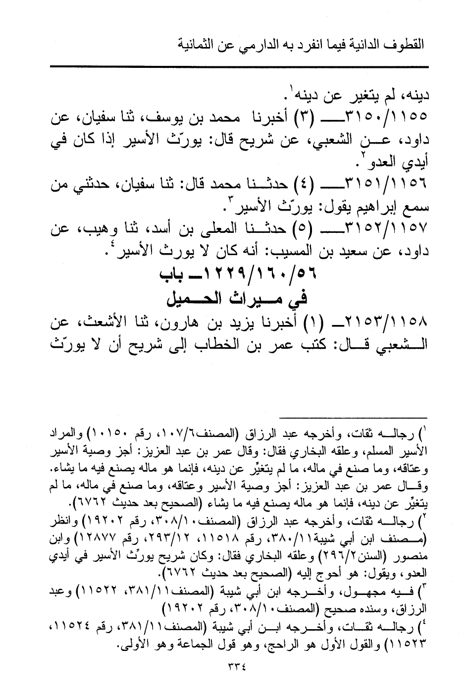 1157/ 3152 - (5) حدثنا المعلى بن أسد، ثنا وهيب، عن داود، عن سعيد بن المسيب: أنه كان لا يورث الأسير (¬4).