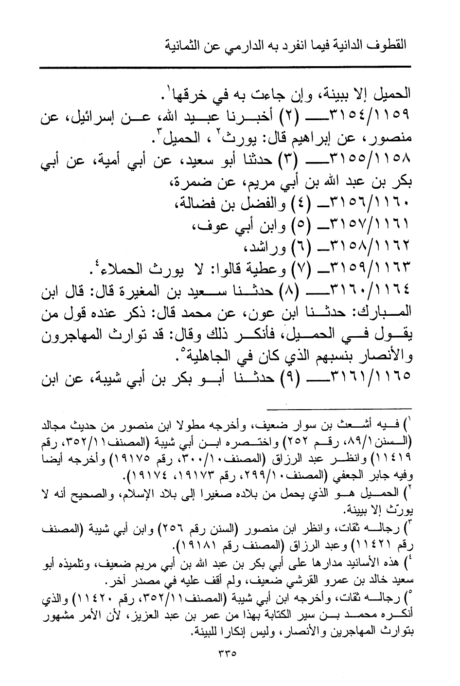 1164/ 3160 - (8) حدثنا سعيد بن المغيرة قال: قال ابن المبارك: حدثنا ابن عون، عن محمد قال: ذكر عنده قول من يقول في الحميل، فأنكر ذلك وقال: قد توارث المهاجرون والأنصار بنسبهم الذي كان في الجاهلية (¬5).