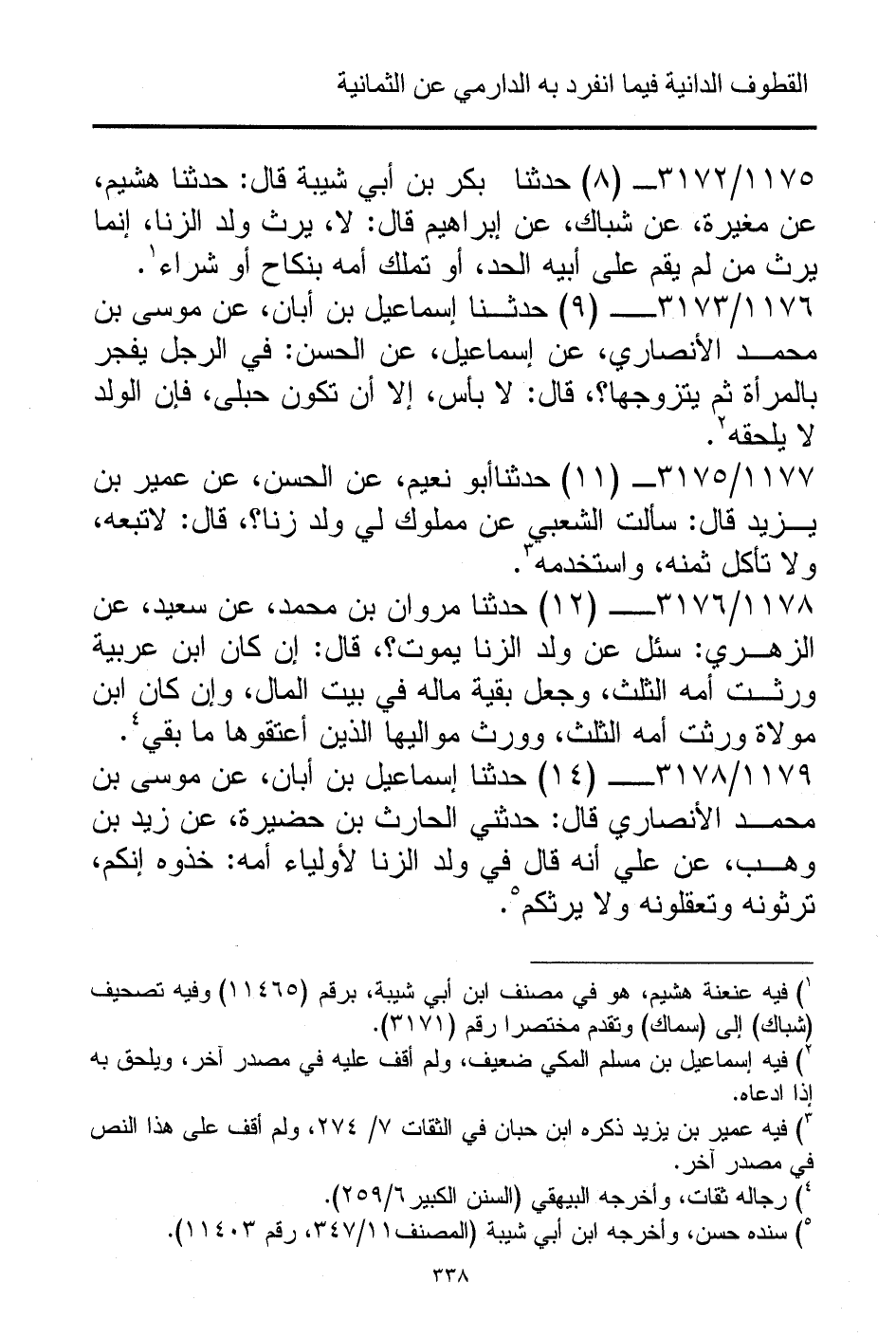1175/ 3172 - (8) حدثنا بكر بن أبي شيبة قال: حدثنا هشيم، عن مغيرة، عن شباك، عن إبراهيم قال: لا، يرث ولد الزنا، إنما يرث من لم يقم على أبيه الحد، أو تملك أمه بنكاح أو شراء (¬1).