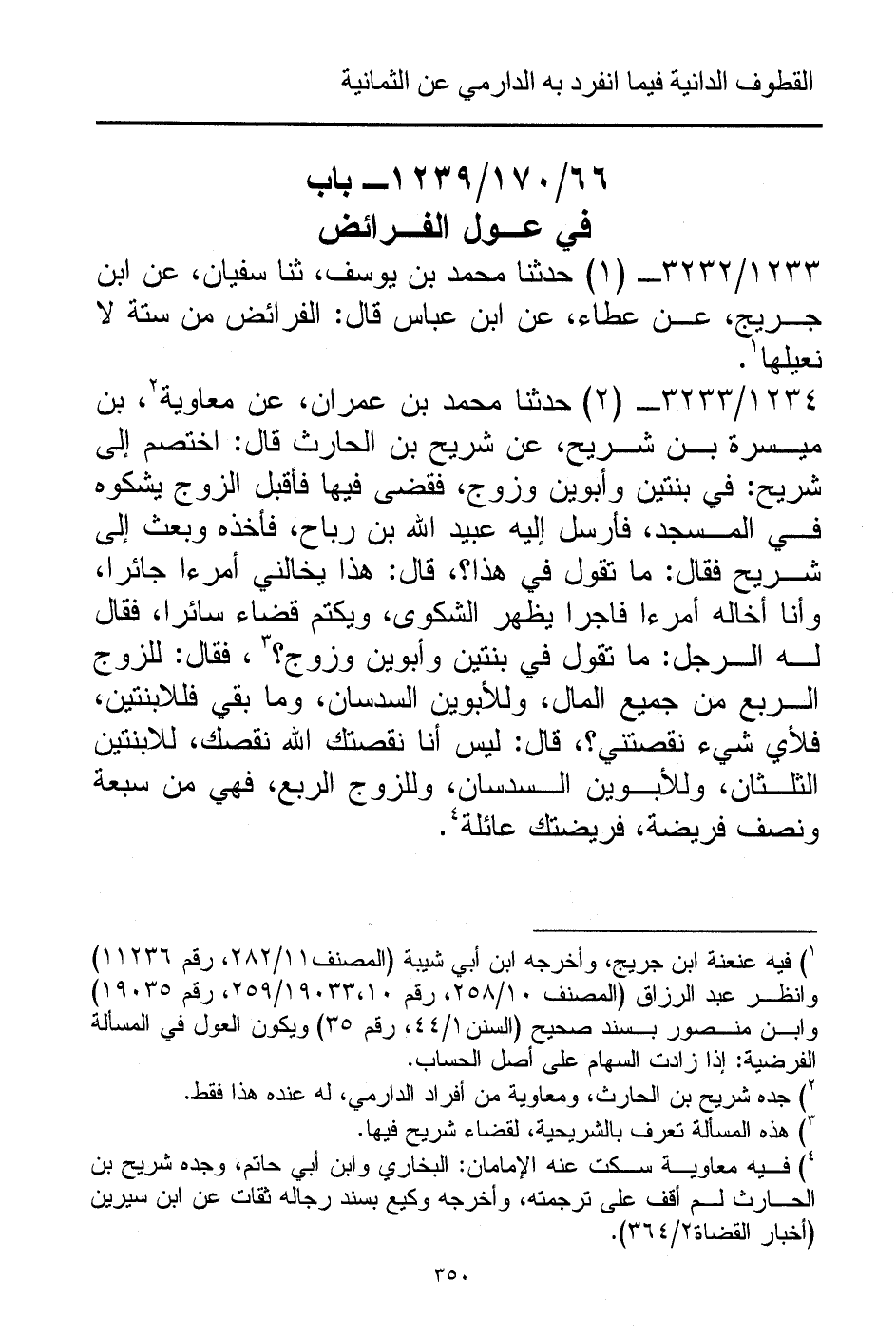 (¬1) فيه عنعنة ابن جريج، وأخرجه ابن أبي شيبة (المصنف 11/ 282، رقم 11236) وانظر عبد الرزاق (المصنف 10/ 258، رقم 19033، 10/ 259، رقم 19035) وابن منصور بسند صحيح (السنن 1/ 44، رقم 35) ويكون العول في المسألة الفرضية: إذا زادت السهام على أصل الحساب.