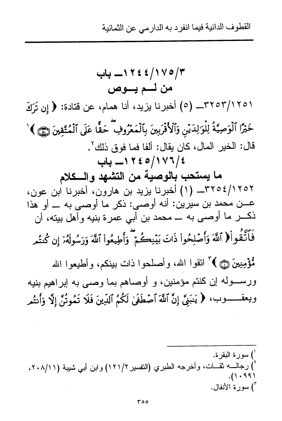 1252/ 3254 - (1) أخبرنا يزيد بن هارون، أخبرنا ابن عون، عن محمد بن سيرين: أنه أوصى: ذكر ما أوصى به - أو هذا ذكر ما أوصى به - محمد بن أبي عمرة بنيه وأهل بيته، أن {فَاتَّقُوا اللَّهَ وَأَصْلِحُوا ذَاتَ بَيْنِكُمْ وَأَطِيعُوا اللَّهَ وَرَسُولَهُ إِنْ كُنْتُمْ مُؤْمِنِينَ} (¬3) اتقوا الله، وأصلحوا ذات بينكم، وأطيعوا الله ورسوله إن كنتم مؤمنين، وأوصاهم بما وصى به إبراهيم بنيه ويعقوب، {يَابَنِيَّ إِنَّ اللَّهَ اصْطَفَى لَكُمُ الدِّينَ فَلَا تَمُوتُنَّ إِلَّا وَأَنْتُمْ