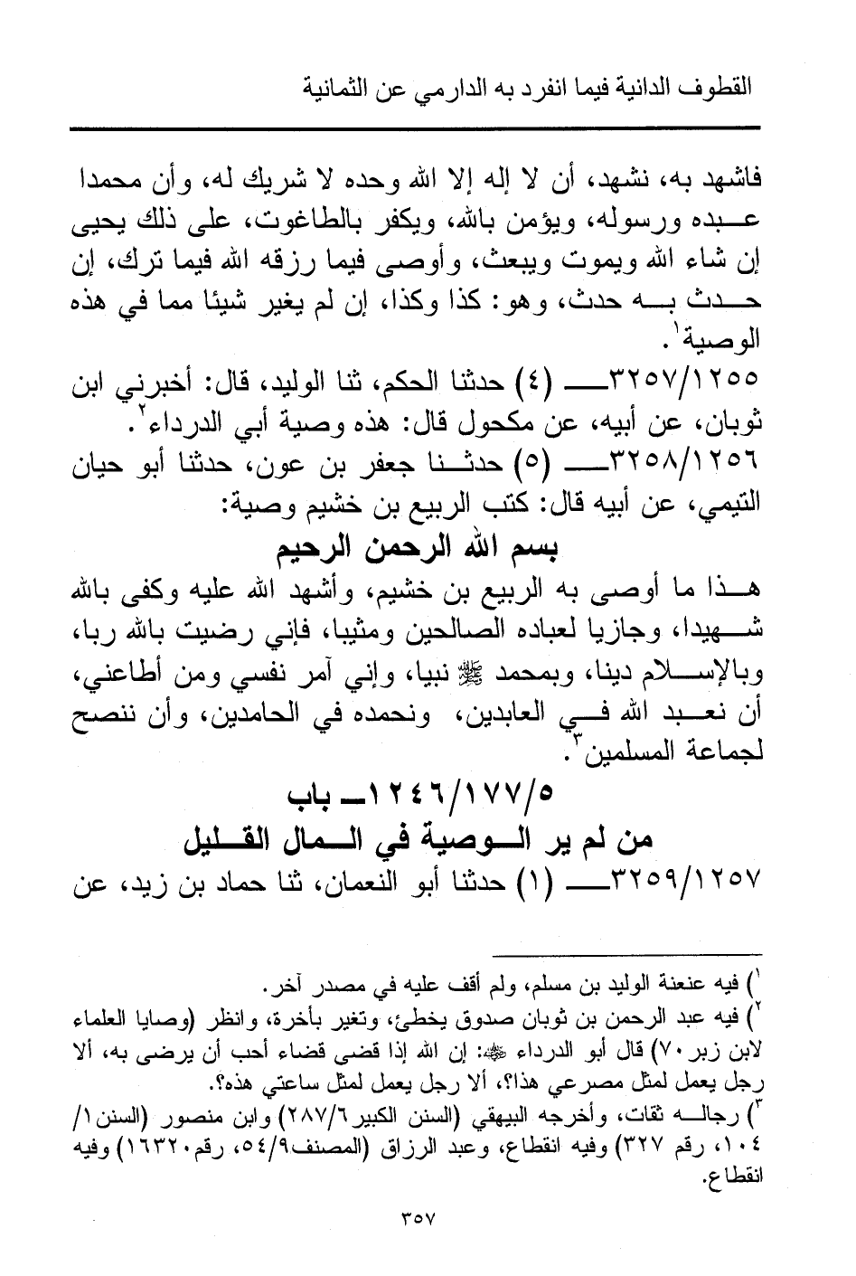 1255/ 3257 - (4) حدثنا الحكم، ثنا الوليد، قال: أخبرني ابن ثوبان، عن أبيه، عن مكحول قال: هذه وصية أبي الدرداء (¬2).