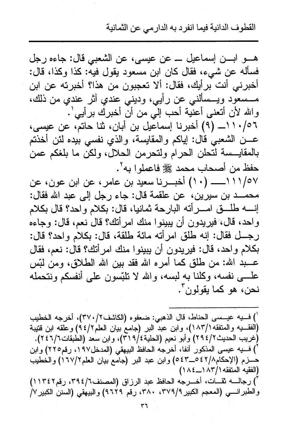 56/ 110 - (9) أخبرنا إسماعيل بن أبان، ثنا حاتم، عن عيسى، عن الشعبي قال: إياكم والمقايسة، والذي نفسي بيده لئن أخذتم بالمقايسة لتحلن الحرام ولتحرمن الحلال، ولكن ما بلغكم عمن حفظ من أصحاب محمد - صلى الله عليه وسلم - فاعملوا به (¬2).