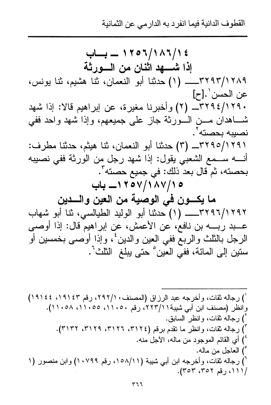 1291/ 3295 - (3) حدثنا أبو النعمان، ثنا هيثم، حدثنا مطرف: أنه سمع الشعبي يقول: إذا شهد رجل من الورثة ففي نصيبه بحصته، ثم قال بعد ذلك: في جميع حصته (¬3).
