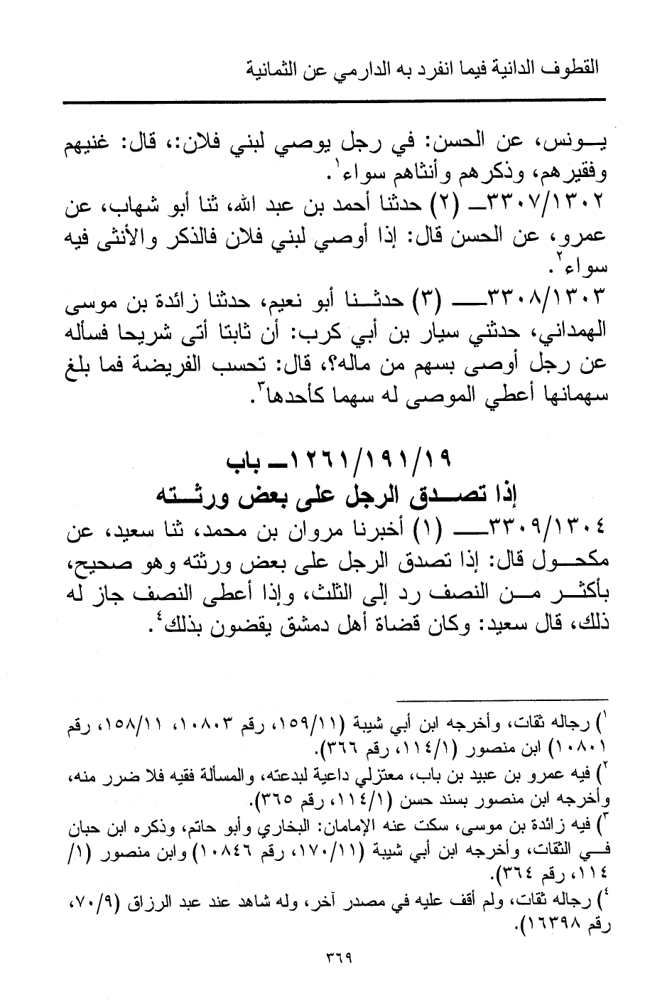 1304/ 3309 - (1) أخبرنا مروان بن محمد، ثنا سعيد، عن مكحول قال: إذا تصدق الرجل على بعض ورثته وهو صحيح، بأكثر من النصف رد إلى الثلث، وإذا أعطى النصف جاز له ذلك، قال سعيد: وكان قضاة أهل دمشق يقضون بذلك (¬4).