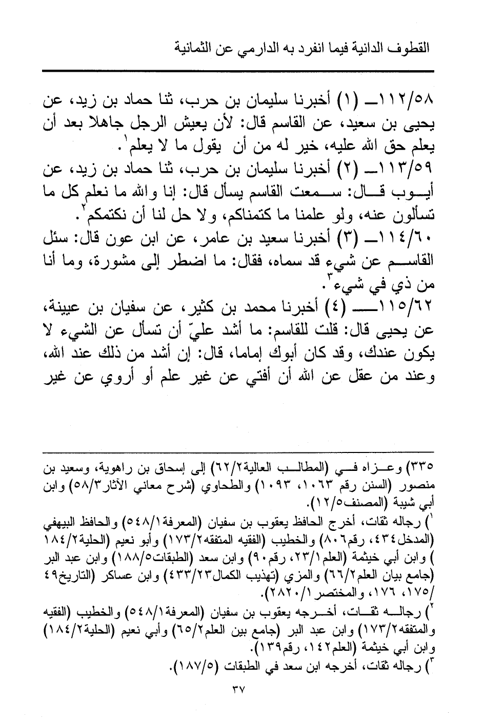 58/ 112 - (1) أخبرنا سليمان بن حرب، ثنا حماد بن زيد، عن يحيى بن سعيد، عن القاسم قال: لأن يعيش الرجل جاهلا بعد أن يعلم حق الله عليه، خير له من أن يقول ما لا يعلم (¬1).