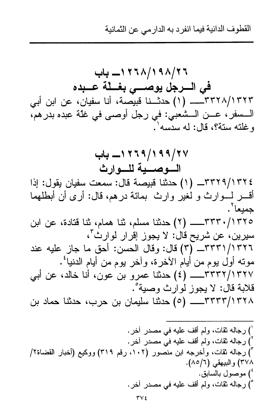 1323/ 3328 - (1) حدثنا قبيصة، أنا سفيان، عن ابن أبي السفر، عن الشعبي: في رجل أوصى في غلّة عبده بدرهم، وغلته ستة؟ ، قال: له سدسه (¬1).