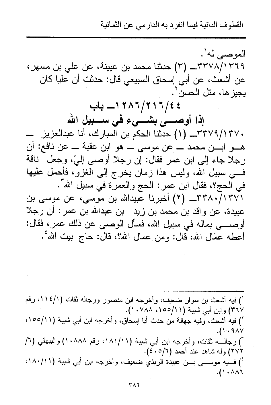 1370/ 3379 - (1) حدثنا الحكم بن المبارك، أنا عبدالعزيز - هو ابن محمد - عن موسى - هو ابن عقبة - عن نافع: أن رجلا جاء إلى ابن عمر فقال: إن رجلا أوصى إليّ، وجعل ناقة في سبيل الله، وليس هذا زمان يخرج إلى الغزو، فأحمل عليها في الحج؟ ، فقال ابن عمر: الحج والعمرة في سبيل الله (¬3).
