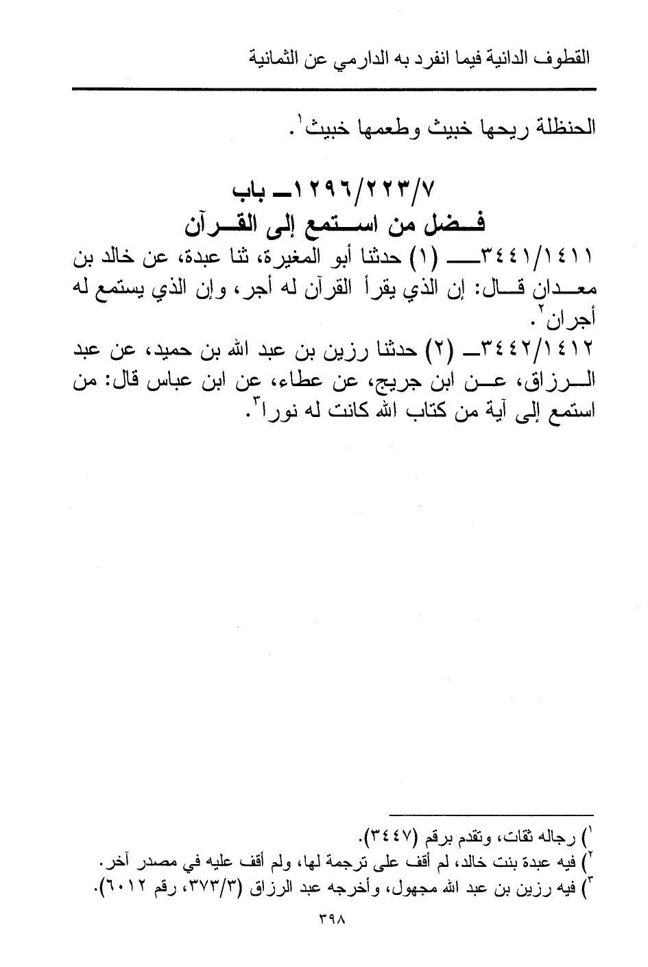 1412/ 3442 - (2) حدثنا رزين بن عبد الله بن حميد، عن عبد الرزاق، عن ابن جريج، عن عطاء، عن ابن عباس قال: من استمع إلى آية من كتاب الله كانت له نورا (¬3).