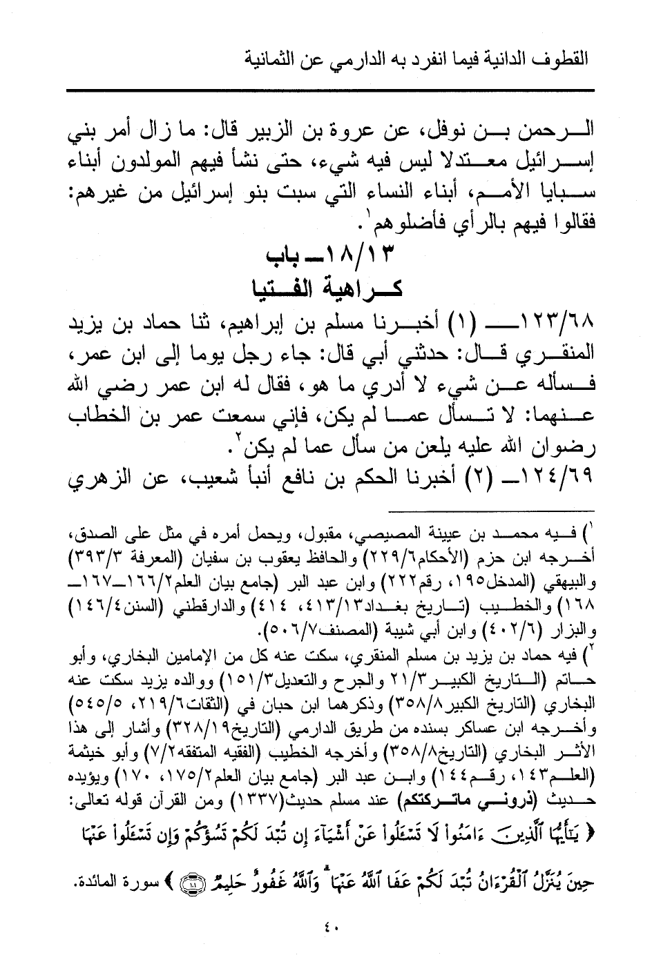 (¬2) فيه حماد بن يزيد بن مسلم المنقري، سكت عنه كل من الإمامين البخاري، وأبو حاتم (التاريخ الكبير 3/ 21 والجرح والتعديل 3/ 151) ووالده يزيد سكت عنه البخاري (التاريخ الكبير 8/ 358) وذكرهما ابن حبان في (الثقات 6/ 219، 5/ 545) وأخرجه ابن عساكر بسنده من طريق الدارمي (التاريخ 19/ 328) وأشار إلى هذا الأثر البخاري (التاريخ 8/ 358) وأخرجه الخطيب (الفقيه المتفقه 2/ 7) وأبو خيثمة (العلم 143، رقم 144) وابن عبد البر (جامع بيان العلم 2/ 175، 170) ويؤيده حديث (ذروني ماتركتكم) عند مسلم حديث (1337) ومن القرآن قوله تعالى: