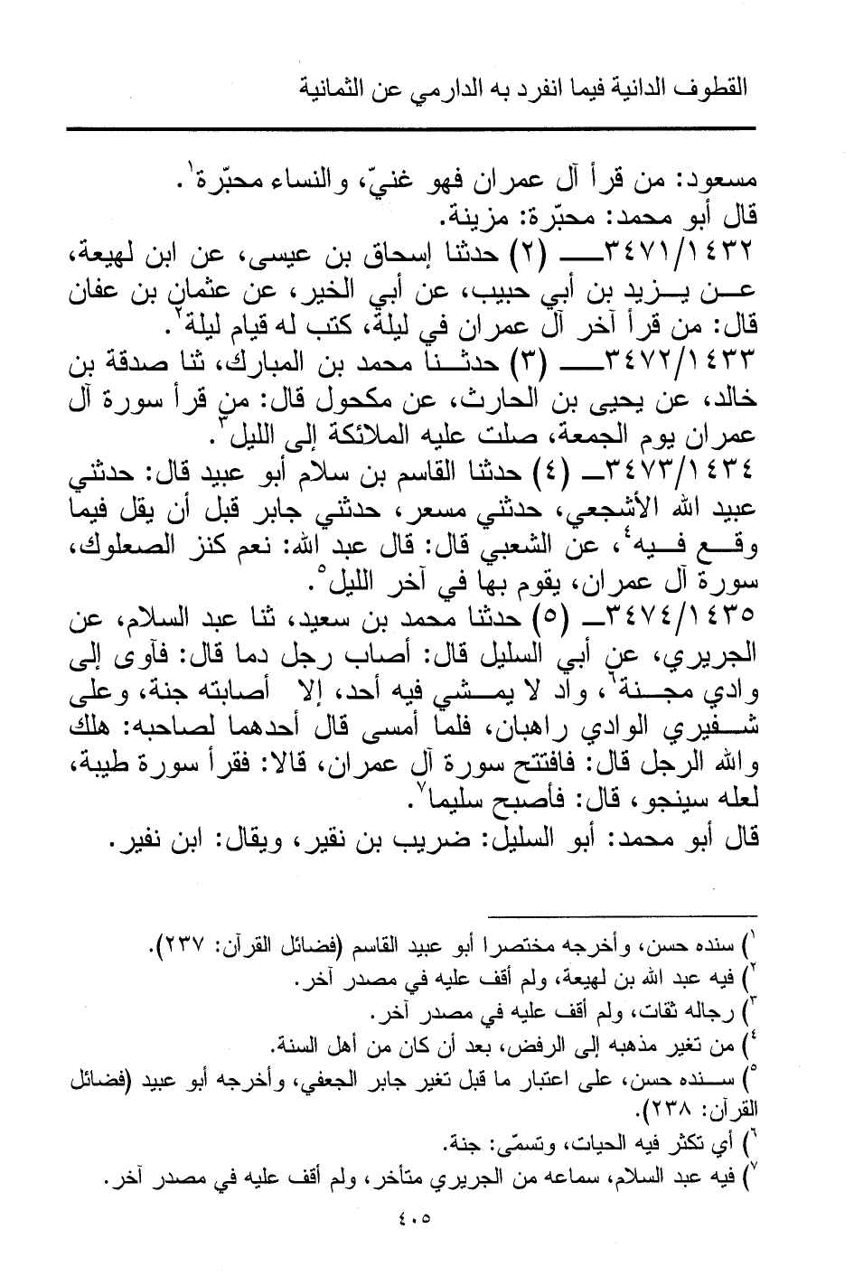 1434/ 3473 - (4) حدثنا القاسم بن سلام أبو عبيد قال: حدثني عبيد الله الأشجعي، حدثني مسعر، حدثني جابر قبل أن يقل فيما وقع فيه (¬4)، عن الشعبي قال: قال عبد الله: نعم كنز الصعلوك، سورة آل عمران، يقوم بها في آخر الليل (¬5).