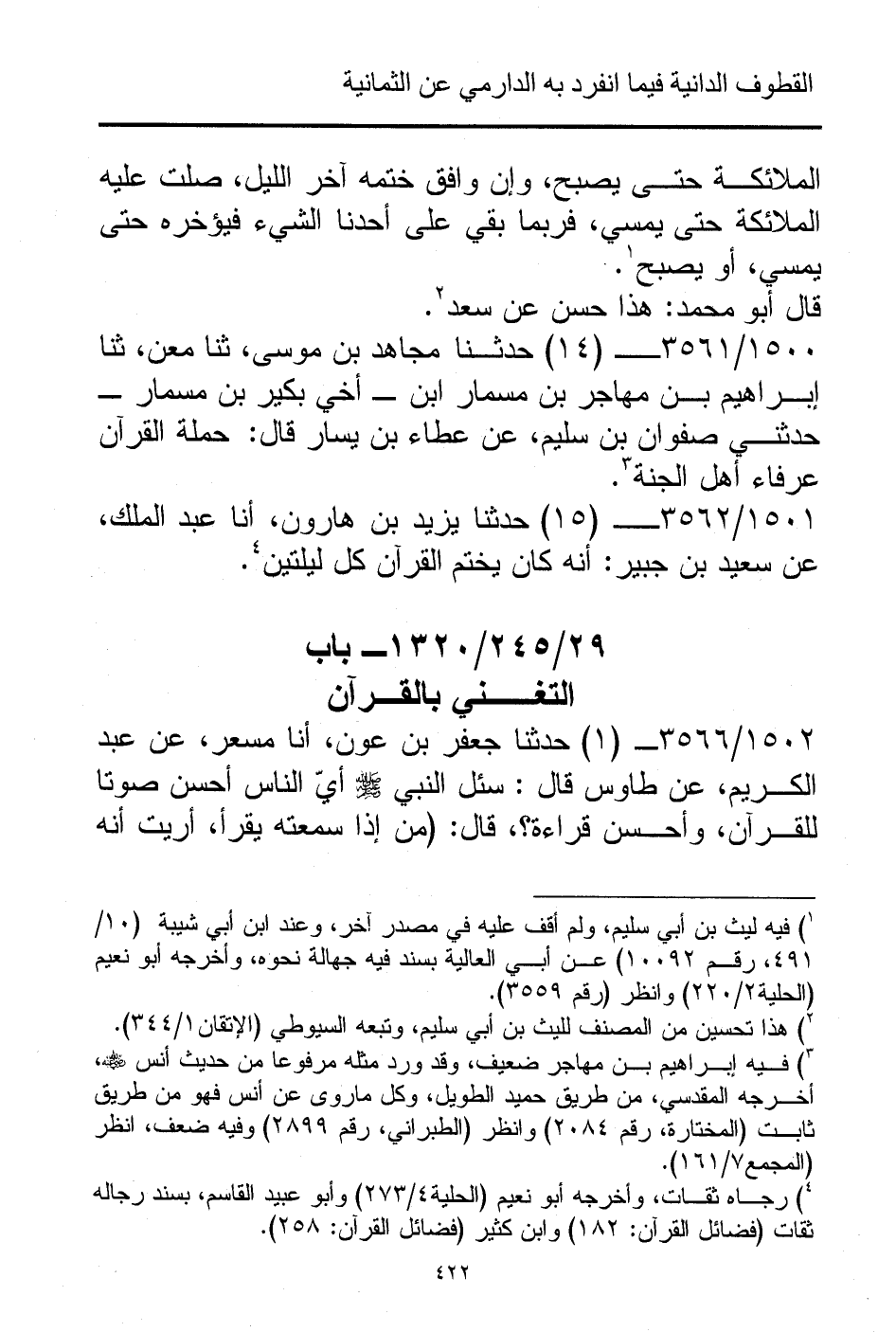 (¬4) رجاه ثقات، وأخرجه أبو نعيم (الحلية 4/ 273) وأبو عبيد القاسم، بسند رجاله ثقات (فضائل القرآن: 182) وابن كثير (فضائل القرآن: 258).