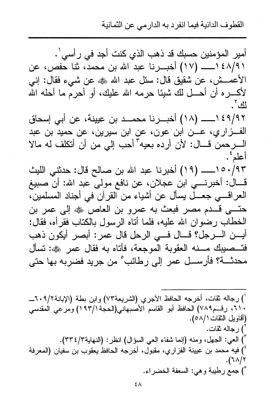 92/ 149 - (18) أخبرنا محمد بن عيينة، عن أبي إسحاق الفزاري، عن ابن عون، عن ابن سيرين، عن حميد بن عبد الرحمن قال: لأن أرده بعيه (¬3) أحب إلي من أن أتكلف له مالا أعلم (¬4).