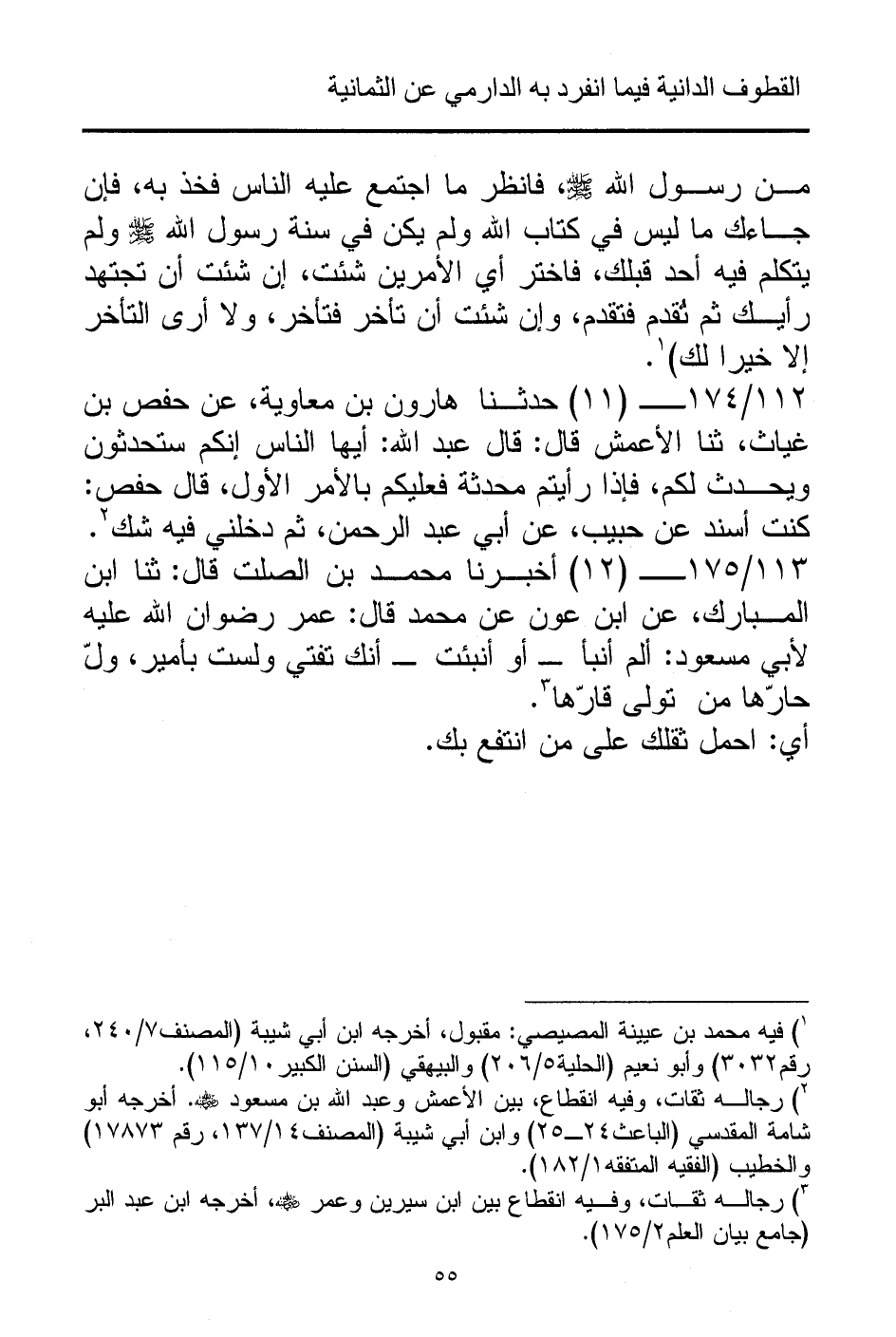 112/ 174 - (11) حدثنا هارون بن معاوية، عن حفص بن غياث، ثنا الأعمش قال: قال عبد الله: أيها الناس إنكم ستحدثون ويحدث لكم، فإذا رأيتم محدثة فعليكم بالأمر الأول، قال حفص: كنت أسند عن حبيب، عن أبي عبد الرحمن، ثم دخلني فيه شك (¬2).
