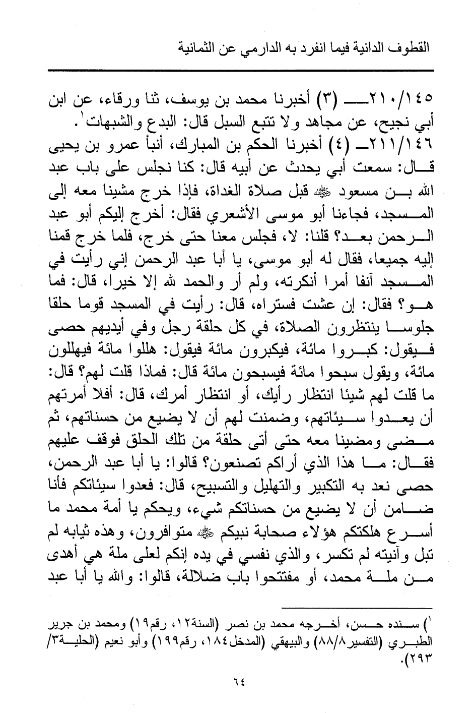 146/ 211 - (4) أخبرنا الحكم بن المبارك، أنبأ عمرو بن يحيى قال: سمعت أبي يحدث عن أبيه قال: كنا نجلس على باب عبد الله بن مسعود - رضي الله عنه - قبل صلاة الغداة، فإذا خرج مشينا معه إلى المسجد، فجاءنا أبو موسى الأشعري فقال: أخرج إليكم أبو عبد الرحمن بعد؟ قلنا: لا، فجلس معنا حتى خرج، فلما خرج قمنا إليه جميعا، فقال له أبو موسى، يا أبا عبد الرحمن إني رأيت في المسجد آنفا أمرا أنكرته، ولم أر والحمد لله إلا خيرا، قال: فما هو؟ فقال: إن عشت فستراه، قال: رأيت في المسجد قوما حلقا جلوسا ينتظرون الصلاة، في كل حلقة رجل وفي أيديهم حصى فيقول: كبروا مائة، فيكبرون مائة فيقول: هللوا مائة فيهللون مائة، ويقول سبحوا مائة فيسبحون مائة قال: فماذا قلت لهم؟ قال: ما قلت لهم شيئا انتظار رأيك، أو انتظار أمرك، قال: أفلا أمرتهم أن يعدوا سيئاتهم، وضمنت لهم أن لا يضيع من حسناتهم، ثم مضى ومضينا معه حتى أتى حلقة من تلك الحلق فوقف عليهم فقال: ما هذا الذي أراكم تصنعون؟ قالوا: يا أبا عبد الرحمن، حصى نعد به التكبير والتهليل والتسبيح، قال: فعدوا سيئاتكم فأنا ضامن أن لا يضيع من حسناتكم شيء، ويحكم يا أمة محمد ما أسرع هلكتكم هؤلاء صحابة نبيكم - رضي الله عنه - متوافرون، وهذه ثيابه لم تبل وآنيته لم تكسر، والذي نفسي في يده إنكم لعلى ملة هي أهدى من ملة محمد، أو مفتتحوا باب ضلالة، قالوا: والله يا أبا عبد