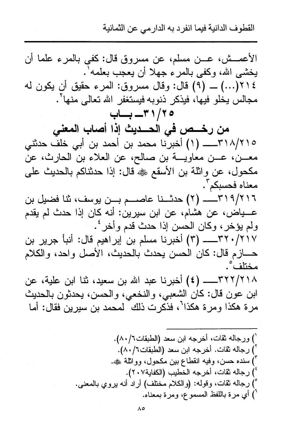 215/ 318 - (1) أخبرنا محمد بن أحمد بن أبي خلف حدثني معن، عن معاوية بن صالح، عن العلاء بن الحارث، عن مكحول، عن واثلة بن الأسقع - رضي الله عنه - قال: إذا حدثناكم بالحديث على معناه فحسبكم (¬3).