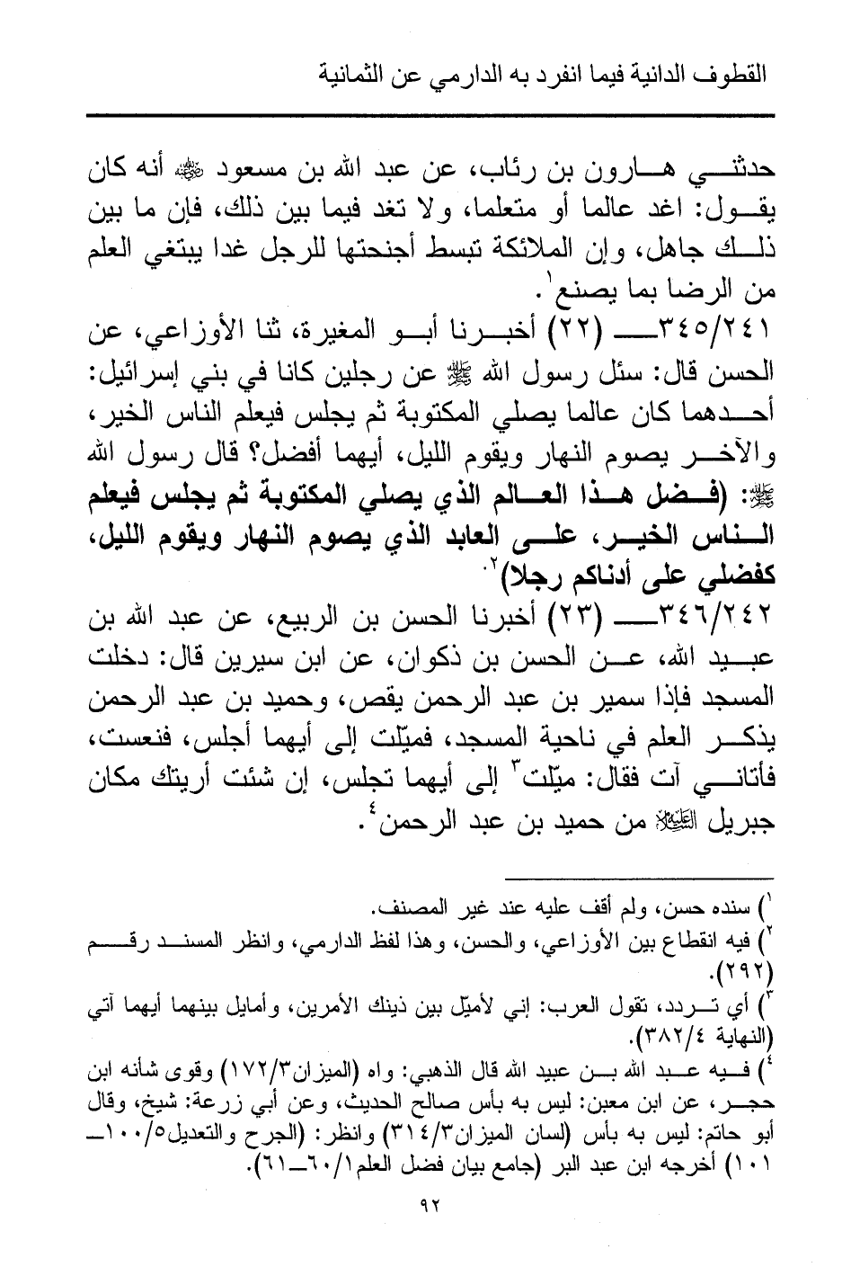 241/ 345 - (22) أخبرنا أبو المغيرة، ثنا الأوزاعي، عن الحسن قال: سئل رسول الله - صلى الله عليه وسلم - عن رجلين كانا في بني إسرائيل: أحدهما كان عالما يصلي المكتوبة ثم يجلس فيعلم الناس الخير، والآخر يصوم النهار ويقوم الليل، أيهما أفضل؟ قال رسول الله - صلى الله عليه وسلم -: (فضل هذا العالم الذي يصلي المكتوبة ثم يجلس فيعلم الناس الخير، على العابد الذي يصوم النهار ويقوم الليل، كفضلي على أدناكم رجلا) (¬2).
