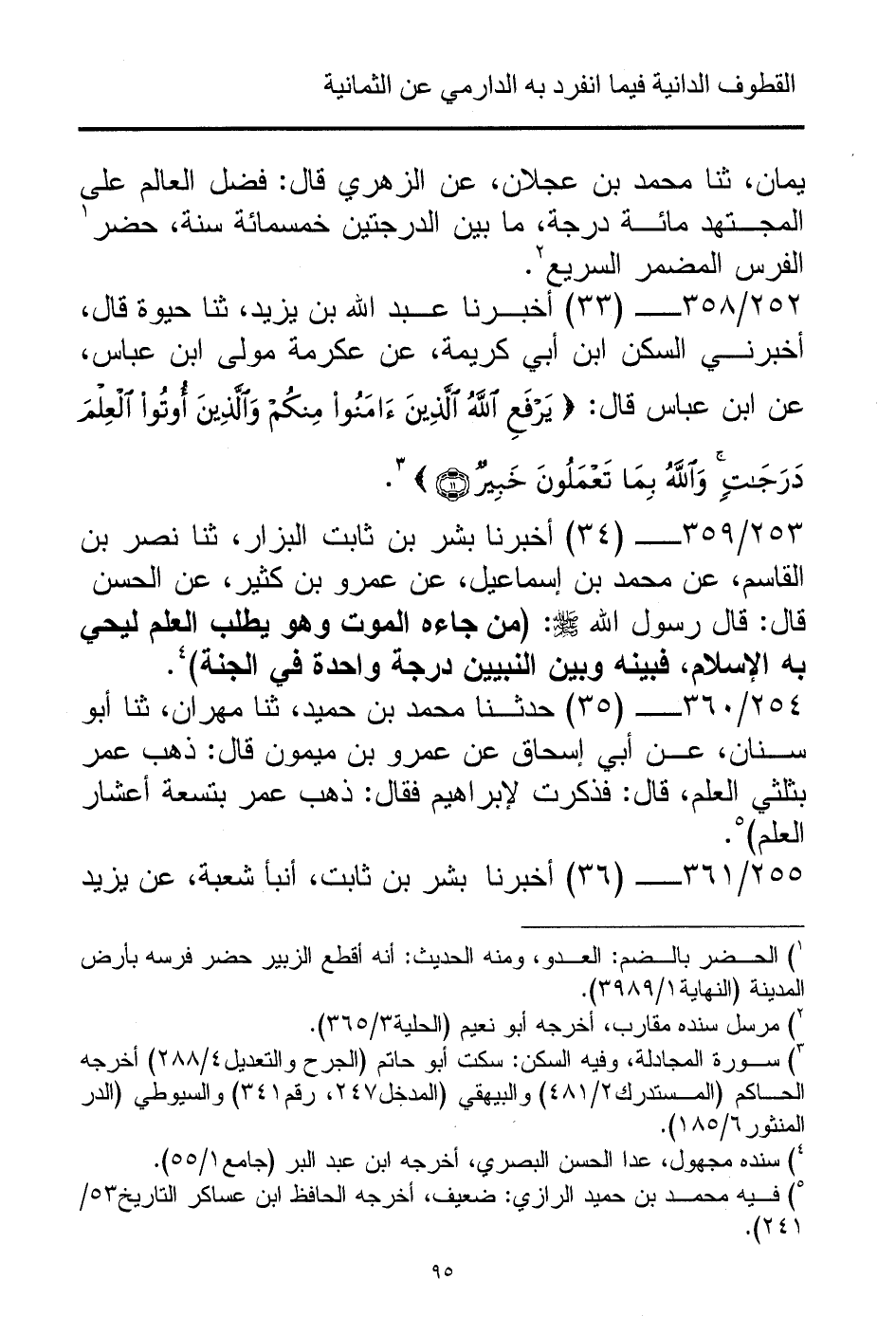 252/ 358 - (33) أخبرنا عبد الله بن يزيد، ثنا حيوة قال، أخبرني السكن ابن أبي كريمة، عن عكرمة مولى ابن عباس، عن ابن عباس قال: {يَرْفَعِ اللَّهُ الَّذِينَ آمَنُوا مِنْكُمْ وَالَّذِينَ أُوتُوا الْعِلْمَ دَرَجَاتٍ وَاللَّهُ بِمَا تَعْمَلُونَ خَبِيرٌ} (¬3).