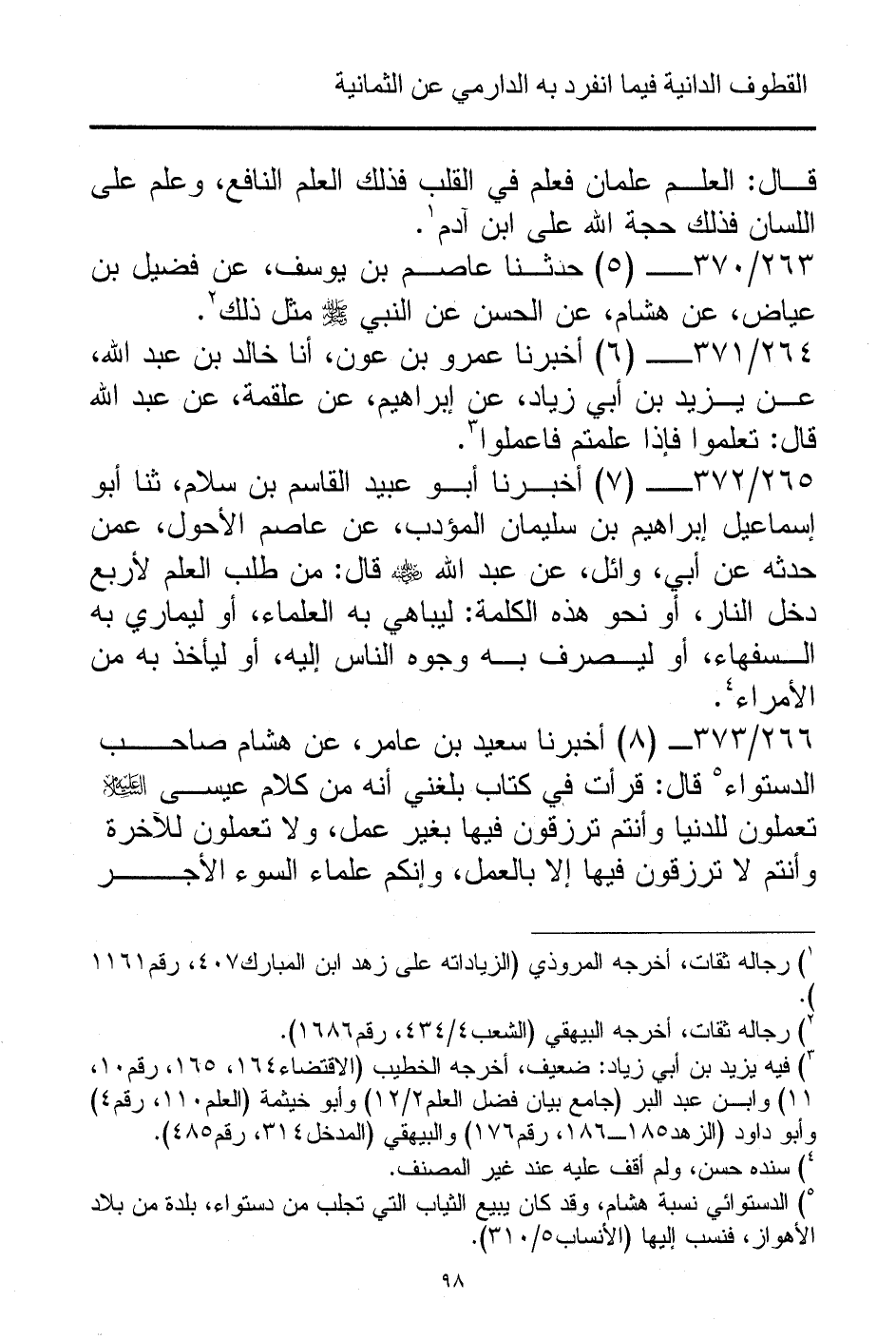 265/ 372 - (7) أخبرنا أبو عبيد القاسم بن سلام، ثنا أبو إسماعيل إبراهيم بن سليمان المؤدب، عن عاصم الأحول، عمن حدثه عن أبي، وائل، عن عبد الله - رضي الله عنه - قال: من طلب العلم لأربع دخل النار، أو نحو هذه الكلمة: ليباهي به العلماء، أو ليماري به السفهاء، أو ليصرف به وجوه الناس إليه، أو ليأخذ به من الأمراء (¬4).