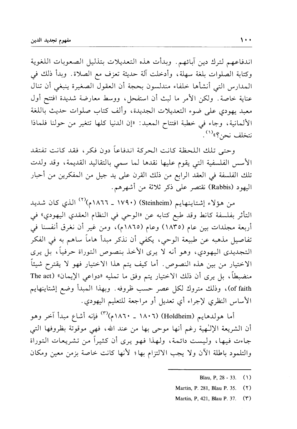 من هؤلاء إشتاينهايم (Steinhiem) (1790 - 1866 م) (¬2) الذي كان شديد التأثر بفلسفة كانط وقد طبع كتابه عن "الوحي في النظام العقدي اليهودي" في أربعة مجلدات بين عام (1835) وعام (1865 م)، ومن غير أن نغرق أنفسنا في تفاصيل مذهبه عن طبيعة الوحي، يكفي أن نذكر مبدأ هامًا ساهم به في الفكر التجديدى اليهودي، وهو أنه لا يرى الأخذ بنصوص التوراة حرفيًا، بل يرى الاختيار من بين هذه النصوص. أما كيف يتم هذا الاختيار فهو لا يقترح شيئًا منضبطًا، بل يرى أن ذلك الاختيار يتم وفق ما تمليه "دواعي الإيمان" (The act of faith)، وذلك متروك لكل عصر حسب ظروفه. وبهذا المبدأ وضع إشتاينهايم الأساس النظري لإجراء أي تعديل أو مراجعة للتعليم اليهودي.