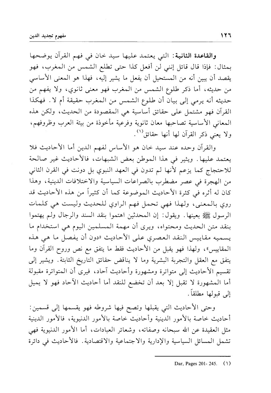 والقاعدة الثانية: التي يعتمد عليها سيد خان في فهم القرآن يوضحها بمثال: فإذا قال قائل إنني لن أفعل كذا حتى تطلع الشمس من المغرب، فهو يقصد أن يبين أنه من المستحيل أن يفعل ما يشير إليه، فهذا هو المعنى الأساسي من حديثه، أما ذكر طلوع الشمس من المغرب فهو معنى ثانوي، ولا يفهم من حديثه أنه يرمي إلى بيان أن طلوع الشمس من المغرب حقيقة أم لا. فهكذا القرآن فهو مشتمل على حقائق أساسية هي المقصودة من الحديث، ولكن هذه المعاني الأساسية تصاحبها معان ثانوية وفرعية مأخوذة من بيئة العرب وظروفهم، ولا يعني ذكر القرآن لها أنها حقائق (¬1).