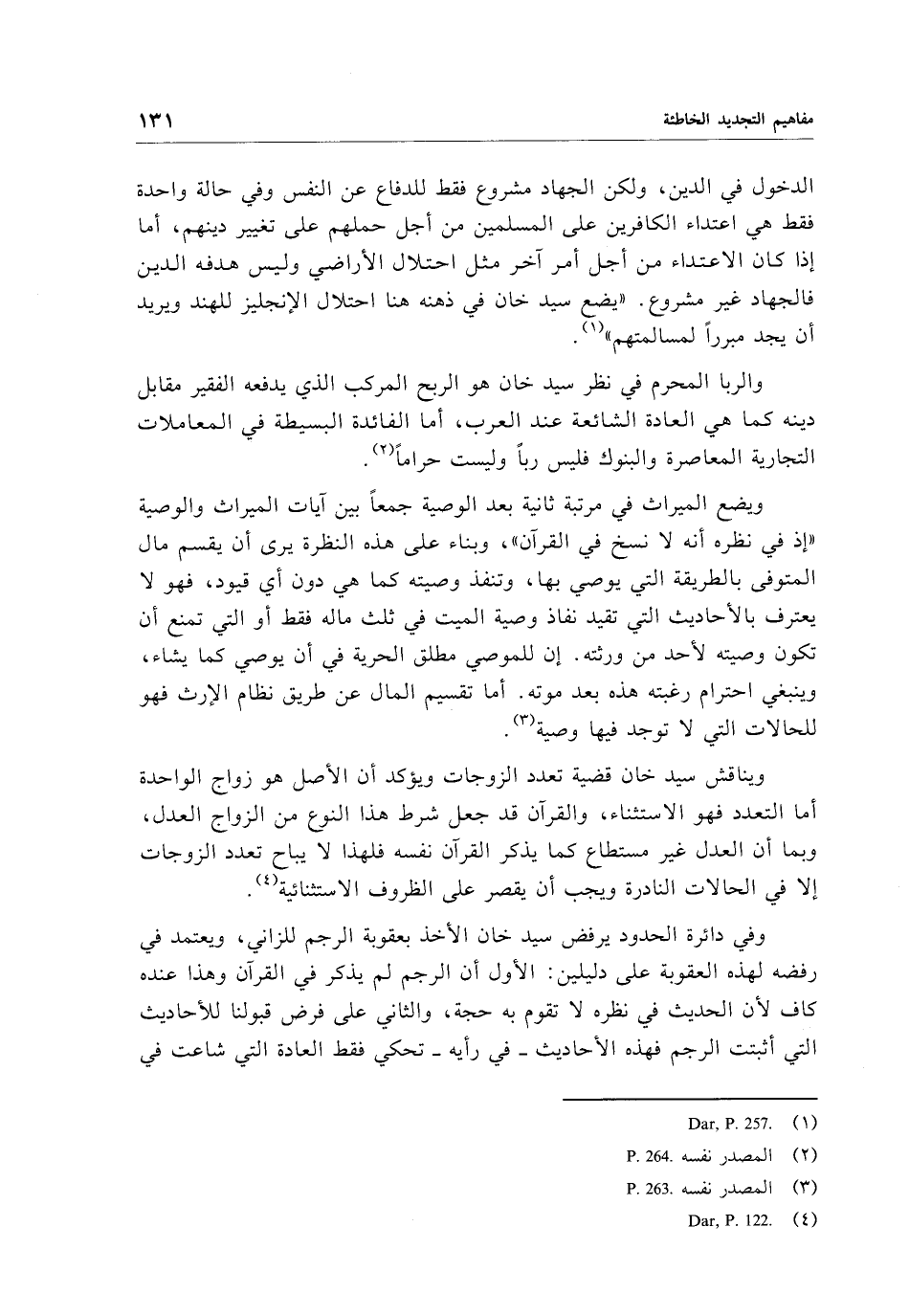الدخول في الدين، ولكن الجهاد مشروع فقط للدفاع عن النفس وفي حالة واحدة فقط هي اعتداء الكافرين على المسلمين من أجل حملهم على تغيير دينهم، أما إذا كان الاعتداء من أجل أمر آخر مثل احتلال الأراضي وليس هدفه الدين فالجهاد غير مشروع. "يضع سيد خان في ذهنه هنا احتلال الإنجليز للهند ويريد أن يجد مبررًا لمسالمتهم" (¬1).