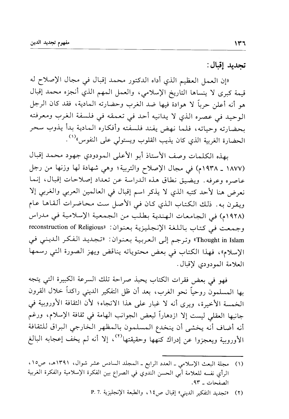 بهذه الكلمات وصف الأستاذ أبو الأعلى المودودي جهود محمد إقبال (1877 - 1938 م) في مجال الإصلاح والتربية؛ وهي شهادة لها وزنها من رجل عاصره وعرفه. ويضيق نطاق هذه الدراسة عن تعداد إصلاحات إقبال، إنما نعرض هنا لأحد كتبه الذي لا يذكر اسم إقبال في العالمين العربي والغربي إلا ويقرن به. ذلك الكتاب الذي كان في الأصل ست محاضرات ألقاها عام (1928 م) في الجامعات الهندية بطلب من الجمعية الإسلامية في مدراس وجمعت في كتاب باللغة الإنجليزية بعنوان: " Thout in islam reconstruction of Religious" وترجم إلى العربية بعنوان: "تجديد الفكر الديني في الإسلام"، فهذا الكتاب في بعض محتوياته يناقض ويهز الصورة التي رسمها العلامة المودودي لإقبال.