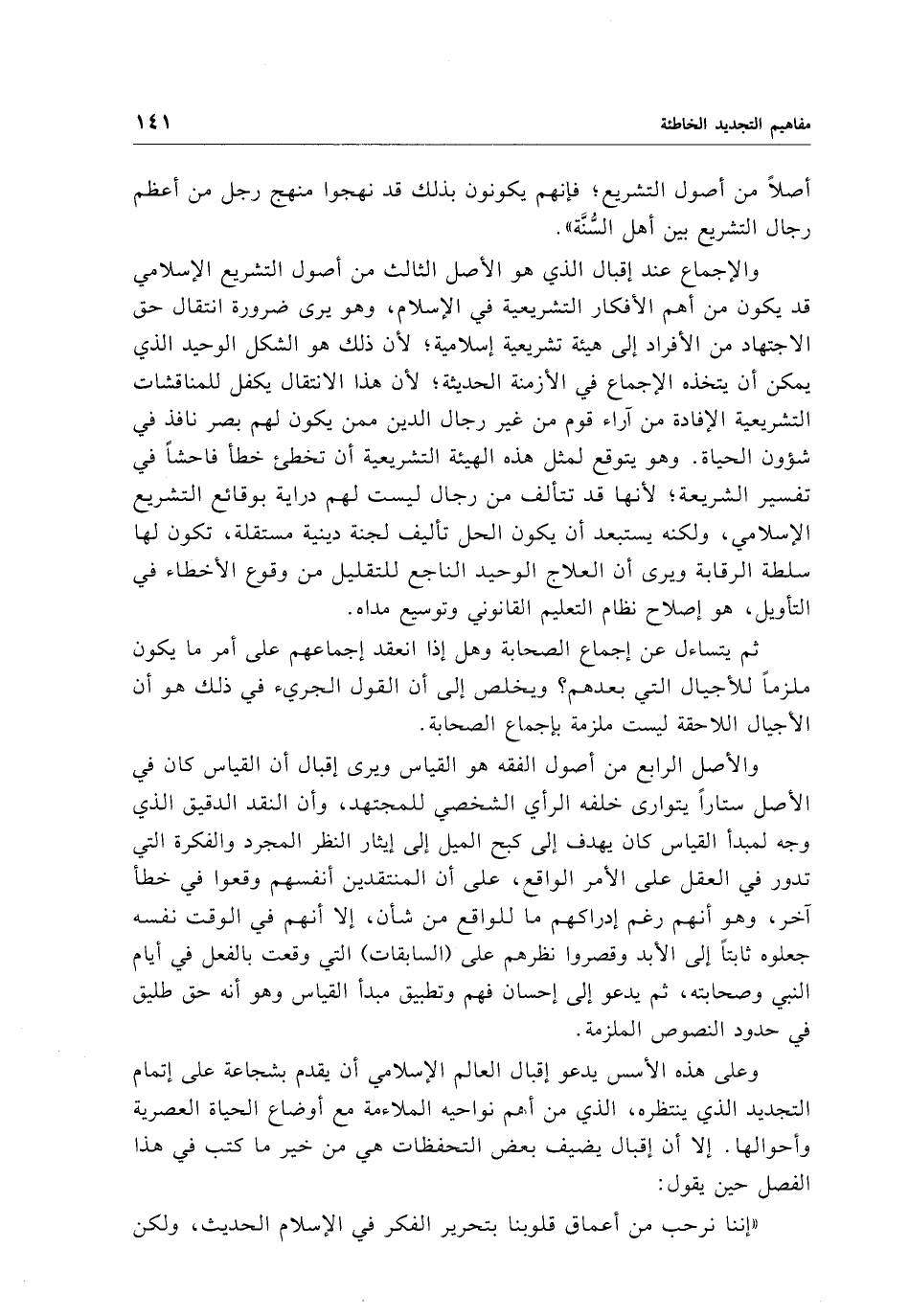 والإجماع عند إقبال الذي هو الأصل الثالث من أصول التشريع الإسلامي قد يكون من أهم الأفكار التشريعية في الإسلام، وهو يرى ضرورة انتقال حق الاجتهاد من الأفراد إلى هيئة تشريعية إسلامية؛ لأن ذلك هو الشكل الوحيد الذي يمكن أن يتخذه الإجماع في الأزمنة الحديثة؛ لأن هذا الانتقال يكفل للمناقشات التشريعية الإفادة من آراء قوم من غير رجال الدين ممن يكون لهم بصر نافذ في شؤون الحياة. وهو يتوقع لمثل هذه الهيئة التشريعية أن تخطئ خطأ فاحشًا في تفسير الشريعة؛ لأنها قد تتألف من رجال ليست لهم دراية بوقائع التشريع الإسلامي، ولكنه يستبعد أن يكون الحل تأليف لجنة دينية مستقلة، تكون لها سلطة الرقابة ويرى أن العلاج الوحيد الناجع للتقليل من وقوع الأخطاء في التأويل، هو إصلاح نظام التعليم القانوني وتوسيع مداه.