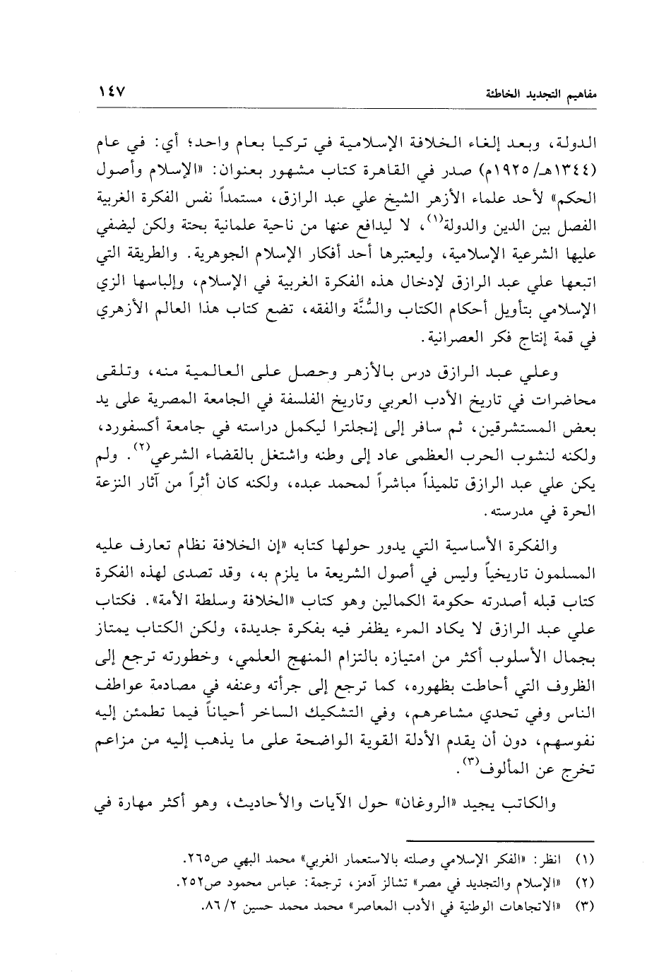 الدولة، وبعد إلغاء الخلافة الإسلامية في تركيا بعام واحد؛ أي: في عام (1344 هـ / 1925 م) صدر في القاهرة كتاب مشهور بعنوان: "الإسلام وأصول الحكم" لأحد علماء الأزهر الشيخ علي عبد الرازق، مستمدًا نفس الفكرة الغربية الفصل بين الدين والدولة (¬1)، لا ليدافع عنها من ناحية علمانية بحتة ولكن ليضفي عليها الشرعية الإسلامية، وليعتبرها أحد أفكار الإسلام الجوهرية. والطريقة التي اتبعها علي عبد الرازق لإدخال هذه الفكرة الغربية في الإسلام، وإلباسها الزي الإسلامي بتأويل أحكام الكتاب والسُّنَّة والفقه، تضع كتاب هذا العالم الأزهري في قمة إنتاج فكر العصرانية.