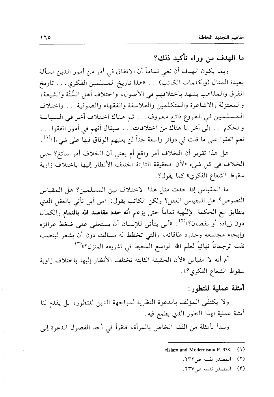 ما المقياس إذا حدث مثل هذا الاختلاف بين المسلمين؟ هل المقياس النصوص؟ هل المقياس العقل؟ ولكن الكاتب يقول: "من أين نأتي بالعقل الذي يتطابق مع الحكمة الإلهية تمامًا حتى يزعم أنه حدد مقاصد الله بالتمام والكمال دون زيادة أو نقصان؟ " (¬2). "أنى يتأتى للإنسان أن يستعلي على ضغط غرائزه وإيحاء مجتمعه وحدود طاقاته، والتي تخطط له مسالك دون أن يشعر لينصب نفسه ترجمانًا نهائيًا لعلم الله الواسع المحيط في تشريعه المنزل؟ " (¬3).