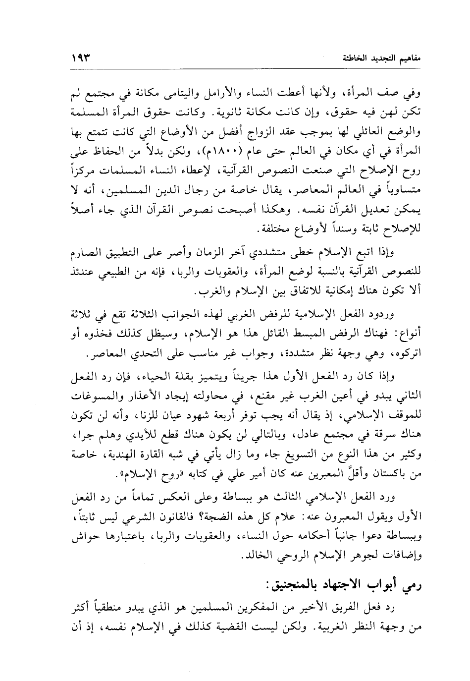 وردود الفعل الإسلامية للرفض الغربي لهذه الجوانب الثلاثة تقع في ثلاثة أنواع: فهناك الرفض المبسط القائل هذا هو الإسلام، وسيظل كذلك فخذوه أو اتركوه، وهي وجهة نظر متشددة، وجواب غير مناسب على التحدي المعاصر.