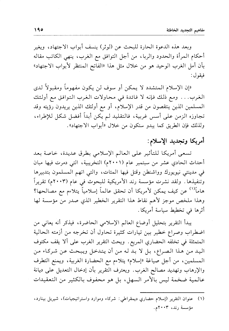 (¬1) عنوان التقرير (إسلام حضاري ديمقراطي: شركاء وموارد واستراتيجيات)، شيريل بينارد، مؤسسة رند، 2003 م.
