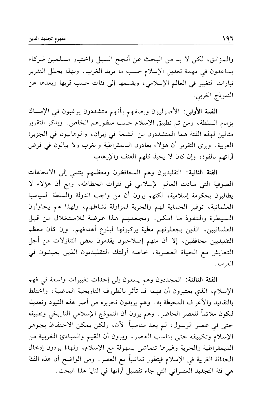 الفئة الثالثة: المجددون وهم يسعون إلى إحداث تغييرات واسعة في فهم الإسلام، الذي يعتبرون أن فهمه قد تأثر بالظروف التاريخية الماضية، واختلط بالتقاليد والأعراف المحيطة به. وهم يريدون تحريره من أصر هذه القيود وتعديله ليكون ملائمًا للعصر الحاضر. وهم يرون أن النموذج الإسلامي التاريخي وتطبيقه حتى في عصر الرسول، لم يعد مناسبًا الآن، ولكن يمكن الاحتفاظ بجوهر الإسلام وتكييفه حتى يناسب العصر، ويرون أن القيم والمبادئ الغربية من الديمقراطية والحرية وغيرها تتماشى بسهولة مع الإسلام، ولهذا يودون إدخال الحداثة الغربية في الإسلام فيتطور تماشيًا مع العصر. ومن الواضح أن هذه الفئة هي فئة التجديد العصراني التي جاء تفصيل آرائها في ثنايا هذا البحث.