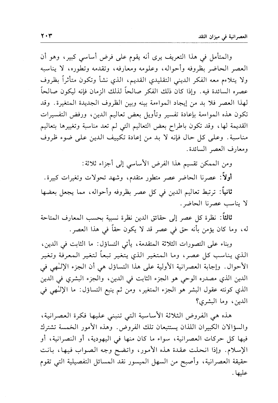 هذه هي الفروض الثلاثة الأساسية التي تنبني عليها فكرة العصرانية، والسؤالان الكبيران اللذان يستتبعان تلك الفروض. وهذه الأمور الخمسة تشترك فيها كل حركات العصرانية، سواء ما كان منها في اليهودية، أو النصرانية، أو الإسلام. وإذا انحلت عقدة هذه الأمور، واتضح وجه الصواب فيها، بانت حقيقة العصرانية، وأصبح من السهل الميسور نقد المسائل التفصيلية التي تقوم عليها.
