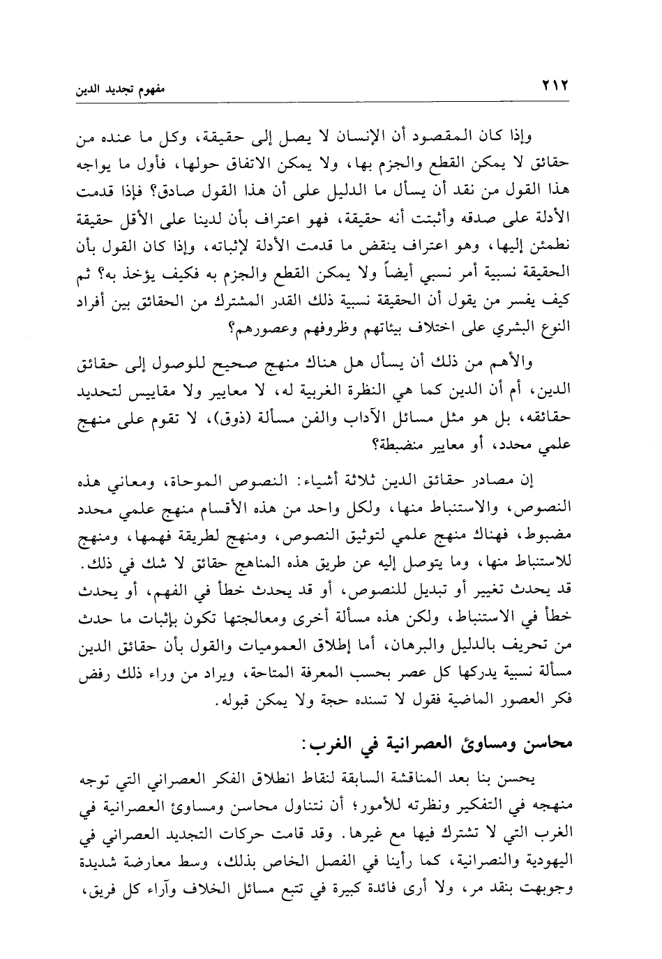 إن مصادر حقائق الدين ثلاثة أشياء: النصوص الموحاة، ومعاني هذه النصوص، والاستنباط منها، ولكل واحد من هذه الأقسام منهج علمي محدد مضبوط، فهناك منهج علمي لتوثيق النصوص، ومنهج لطريقة فهمها، ومنهج للاستنباط منها، وما يتوصل إليه عن طريق هذه المناهج حقائق لا شك في ذلك. قد يحدث تغيير أو تبديل للنصوص، أو قد يحدث خطأ في الفهم، أو يحدث خطأ في الاستنباط، ولكن هذه مسألة أخرى ومعالجتها تكون بإثبات ما حدث من تحريف بالدليل والبرهان، أما إطلاق العموميات والقول بأن حقائق الدين مسألة نسبية يدركها كل عصر بحسب المعرفة المتاحة، ويراد من وراء ذلك رفض فكر العصور الماضية فقول لا تسنده حجة ولا يمكن قبوله.