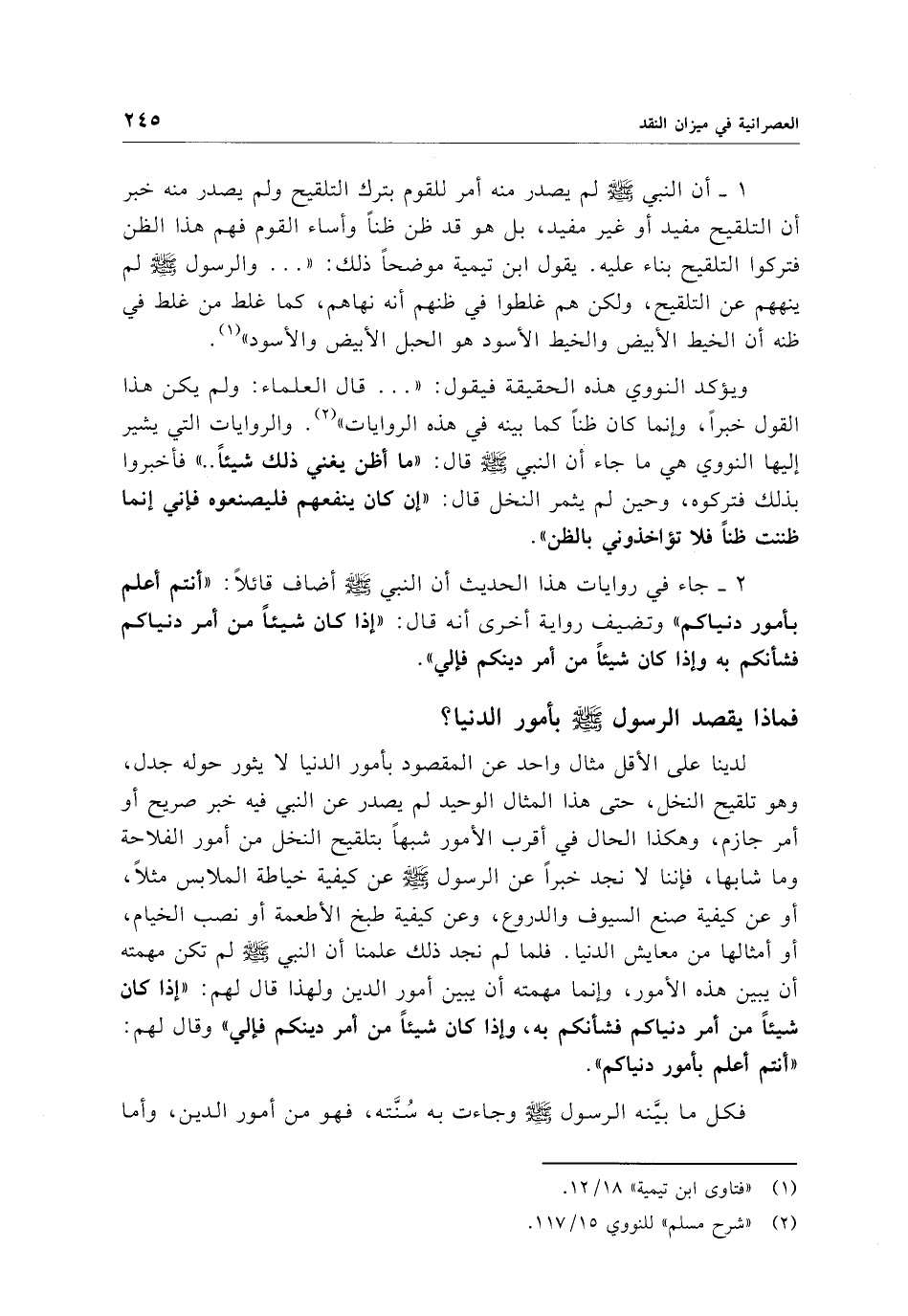 ويؤكد النووي هذه الحقيقة فيقول: ". . . قال العلماء: ولم يكن هذا القول خبرًا، وإنما كان ظنًا كما بينه في هذه الروايات" (¬2). والروايات التي يشير إليها النووي هي ما جاء أن النبي - صلى الله عليه وسلم - قال: "ما أظن يغني ذلك شيئًا. ." فأخبروا بذلك فتركوه، وحين لم يثمر النخل قال: "إن كان ينفعهم فليصنعوه فإني إنما ظننت ظنًا فلا تؤاخذوني بالظن".