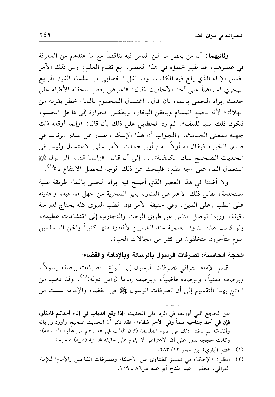 وثانيهما: أن من بعض ما ظن الناس فيه تناقضًا مع ما عندهم من المعرفة في عصرهم، قد ظهر خطؤه في هذا العصر، مع تقدم العلم، ومن ذلك الأمر بغسل الإناء الذي يلغ فيه الكلب. وقد نقل الخطابي من علماء القرن الرابع الهجري اعتراضًا على أحد الأحاديث فقال: "اعترض بعض سخفاء الأطباء على حديث إبراد الحمى بالماء بأن قال: اغتسال المحموم بالماء خطر يقربه من الهلاك؛ لأنه يجمع المسام ويحقن البخار، ويعكس الحرارة إلى داخل الجسم، فيكون ذلك سببًا للتلف". ثم رد الخطابي على ذلك بأن قال: "وإنما أوقعه ذلك جهله بمعنى الحديث، والجواب أن هذا الإشكال صدر عن صدر مرتاب في صدق الخبر، فيقال له أولًا: من أين حملت الأمر على الاغتسال وليس في الحديث الصحيح بيان الكيفية". . . إلى أن قال: "وإنما قصد الرسول - صلى الله عليه وسلم - استعمال الماء على وجه ينفع، فليبحث عن ذلك الوجه ليحصل الانتفاع به" (¬1).
