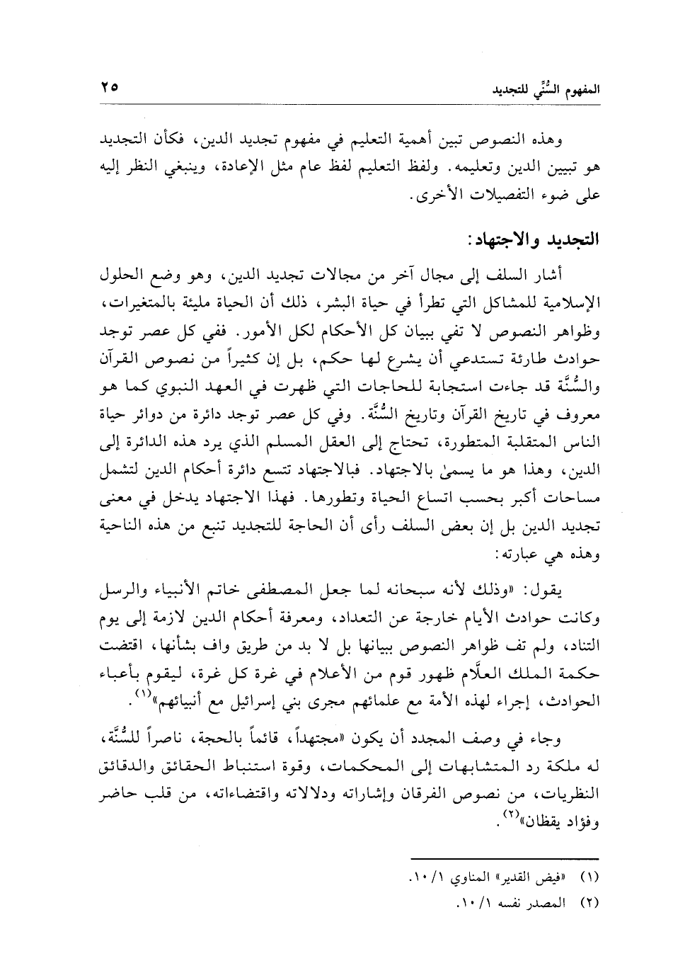 وهذه النصوص تبين أهمية التعليم في مفهوم تجديد الدين، فكأن التجديد هو تبيين الدين وتعليمه. ولفظ التعليم لفظ عام مثل الإعادة، وينبغي النظر إليه على ضوء التفصيلات الأخرى.