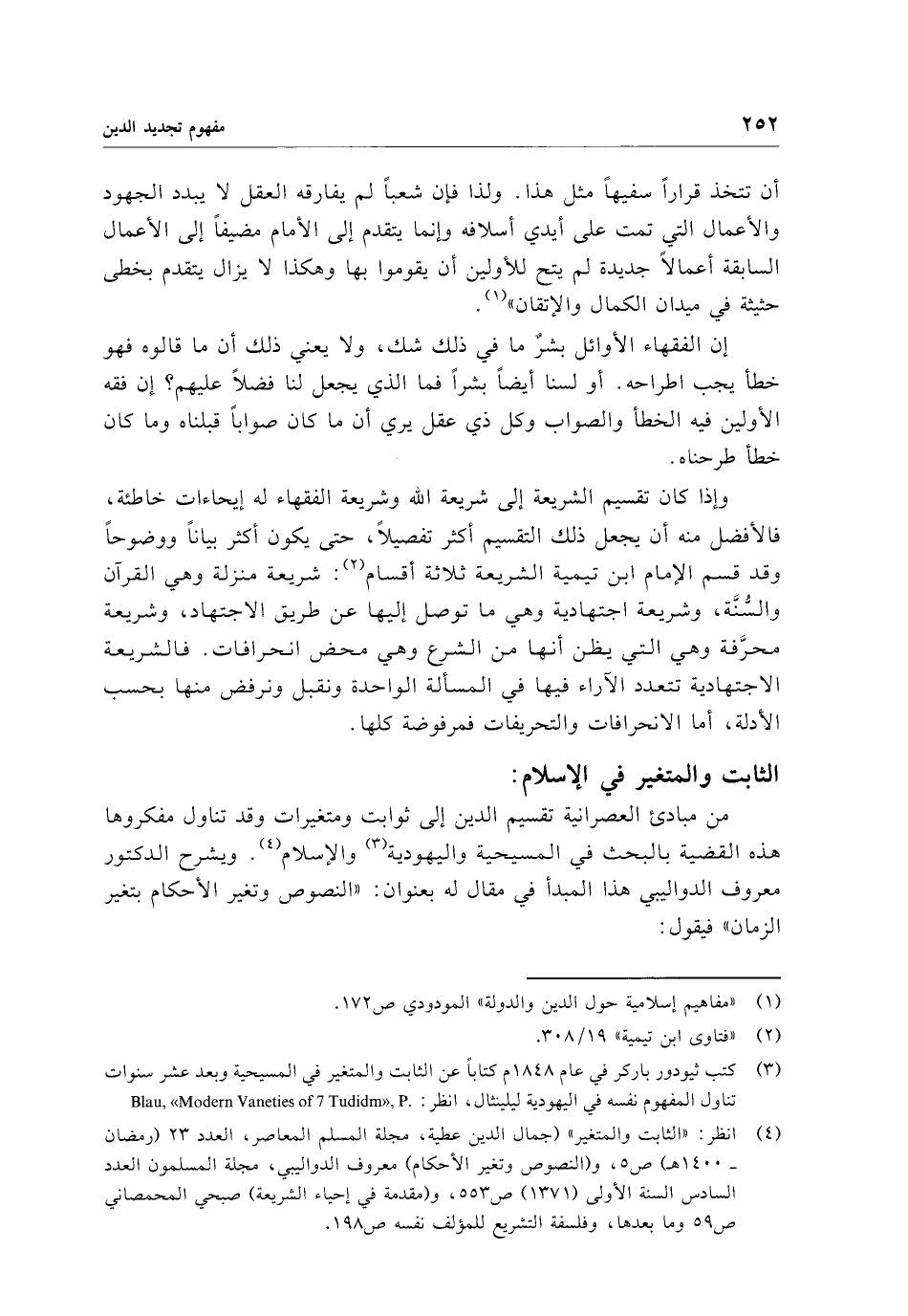 (¬4) انظر: "الثابت والمتغير" (جمال الدين عطية، مجلة المسلم المعاصر، العدد 23) رمضان - 1400 هـ) ص 5، و (النصوص وتغير الأحكام) معروف الدواليبي، مجلة المسلمون العدد السادس السنة الأولى (1371) ص 553، و (مقدمة في إحياء الشريعة) صبحي المحمصاني ص 59 وما بعدها، وفلسفة التشريع للمؤلف نفسه ص 198.