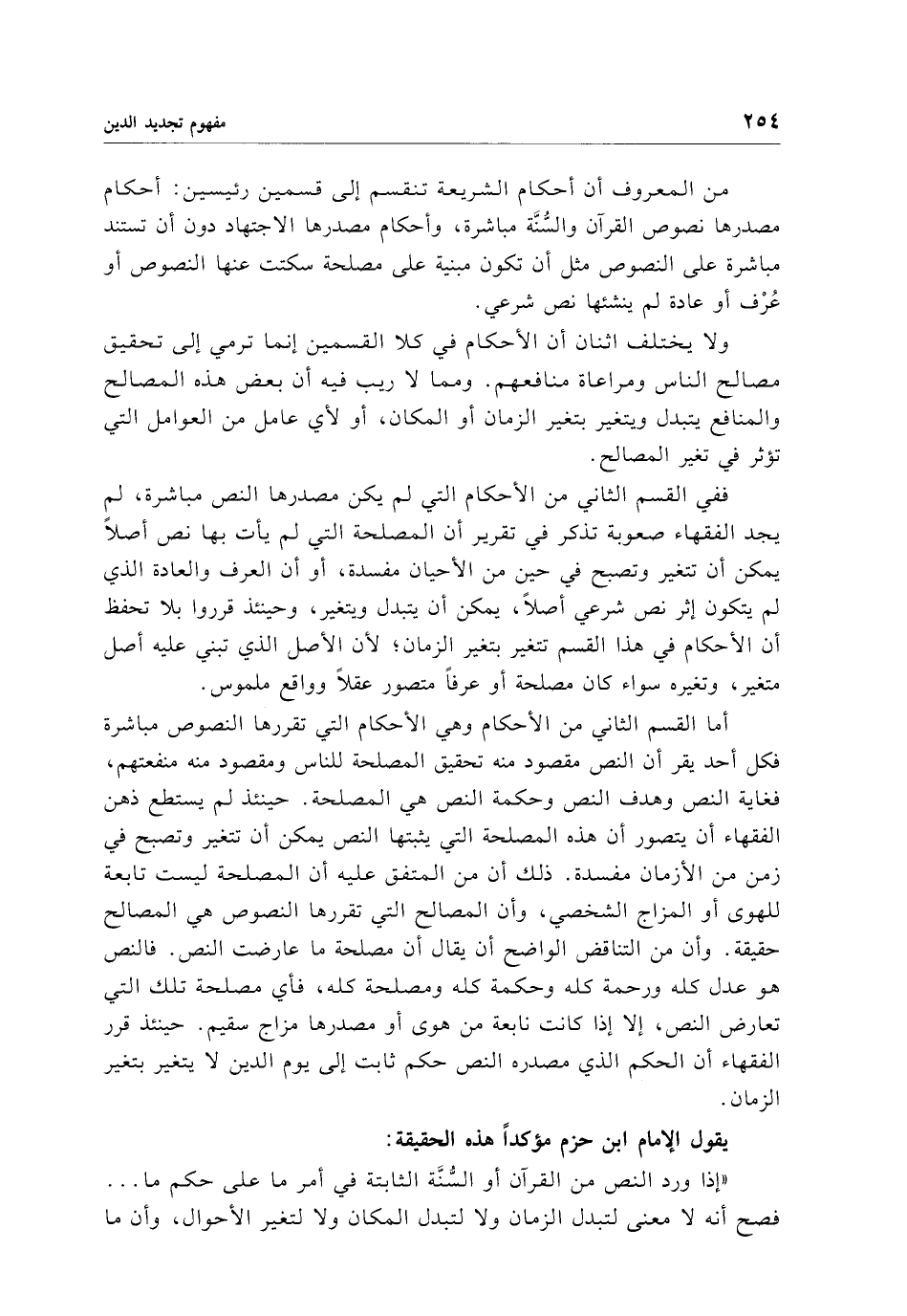 "إذا ورد النص من القرآن أو السُّنَّة الثابتة في أمر ما على حكم ما. . . فصح أنه لا معنى لتبدل الزمان ولا لتبدل المكان ولا لتغير الأحوال، وأن ما