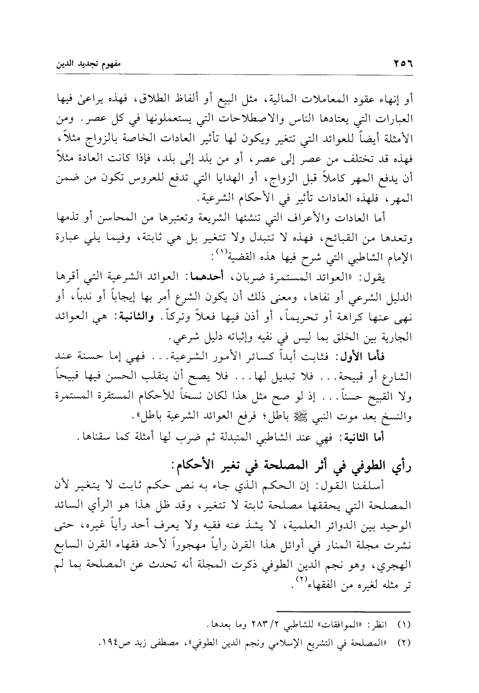 أسلفنا القول: إن الحكم الذي جاء به نص حكم ثابت لا يتغير لأن المصلحة التي يحققها مصلحة ثابتة لا تتغير، وقد ظل هذا هو الرأي السائد الوحيد بين الدوائر العلمية، لا يشذ عنه فقيه ولا يعرف أحد رأيًا غيره، حتى نشرت مجلة المنار في أوائل هذا القرن رأيًا مهجورًا لأحد فقهاء القرن السابع الهجري، وهو نجم الدين الطوفي ذكرت المجلة أنه تحدث عن المصلحة بما لم تر مثله لغيره من الفقهاء (¬2).