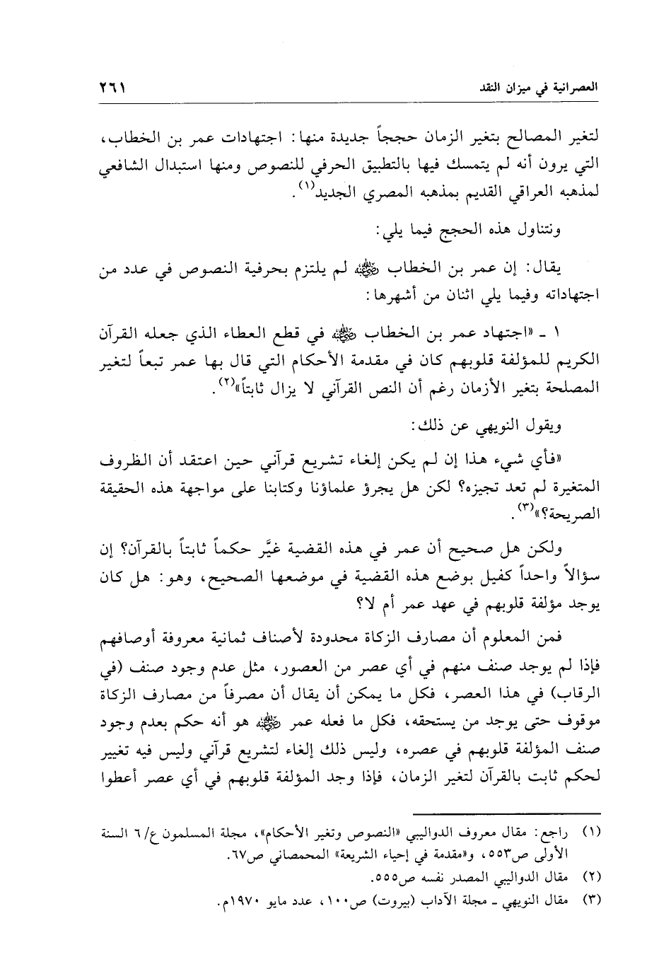 (¬1) راجع: مقال معروف الدواليبي "النصوص وتغير الأحكام"، مجلة المسلمون ع/ 6 السنة الأولى ص 553، و"مقدمة في إحياء الشريعة" المحمصاني ص 67.