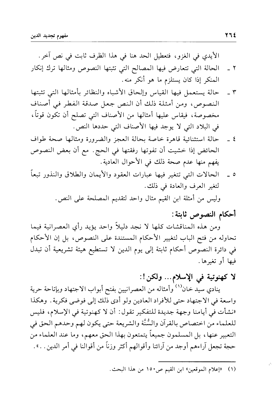 ينادي سيد خان (¬1) وأمثاله من العصرانيين بفتح أبواب الاجتهاد وبإتاحة حرية واسعة في الاجتهاد حتى للأفراد العادين ولو أدى ذلك إلى فوضى فكرية. وهكذا "نشأت في أيامنا وجهة جديدة للتفكير تقول: أن لا كهنوتية في الإسلام، فليس للعلماء من اختصاص بالقرآن والسُّنَّة والشريعة حتى يكون لهم وحدهم الحق في التعبير عنها، بل المسلمون جميعًا يتمتعون بهذا الحق معهم، وما عند العلماء من حجة تجعل آراءهم أوجد من آرائنا وأقوالهم أكثر وزنًا من أقوالنا في أمر الدين. .".