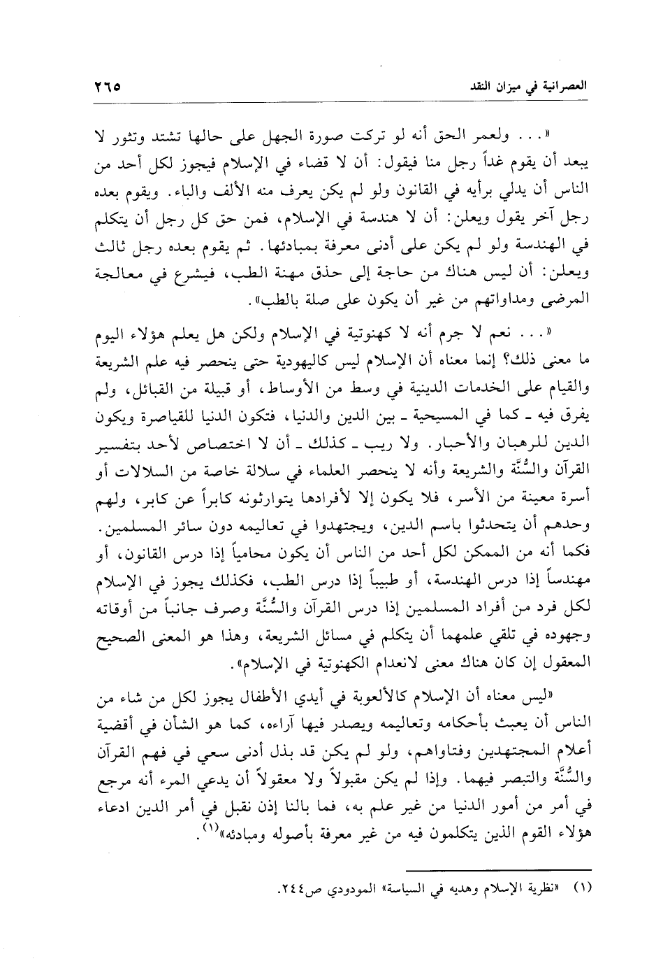 ". . . نعم لا جرم أنه لا كهنوتية في الإسلام ولكن هل يعلم هؤلاء اليوم ما معنى ذلك؟ إنما معناه أن الإسلام ليس كاليهودية حتى ينحصر فيه علم الشريعة والقيام على الخدمات الدينية في وسط من الأوساط، أو قبيلة من القبائل، ولم يفرق فيه -كما في المسيحية- بين الدين والدنيا، فتكون الدنيا للقياصرة ويكون الدين للرهبان والأحبار. ولا ريب -كذلك- أن لا اختصاص لأحد بتفسير القرآن والسُّنَّة والشريعة وأنه لا ينحصر العلماء في سلالة خاصة من السلالات أو أسرة معينة من الأسر، فلا يكون إلا لأفرادها يتوارثونه كابرًا عن كابر، ولهم وحدهم أن يتحدثوا باسم الدين، ويجتهدوا في تعاليمه دون سائر المسلمين. فكما أنه من الممكن لكل أحد من الناس أن يكون محاميًا إذا درس القانون، أو مهندسًا إذا درس الهندسة، أو طبيبًا إذا درس الطب، فكذلك يجوز في الإسلام لكل فرد من أفراد المسلمين إذا درس القرآن والسُّنَّة وصرف جانبًا من أوقاته وجهوده في تلقي علمهما أن يتكلم في مسائل الشريعة، وهذا هو المعنى الصحيح المعقول إن كان هناك معنى لانعدام الكهنوتية في الإسلام".