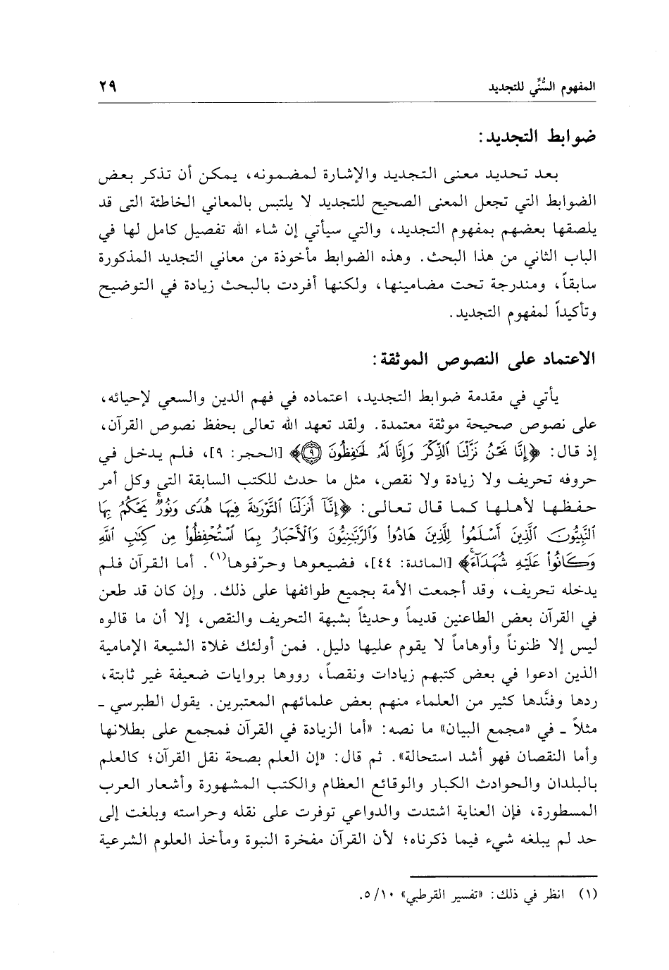 يأتي في مقدمة ضوابط التجديد، اعتماده في فهم الدين والسعي لإحيائه، على نصوص صحيحة موثقة معتمدة. ولقد تعهد الله تعالى بحفظ نصوص القرآن، إذ قال: {إِنَّا نَحْنُ نَزَّلْنَا الذِّكْرَ وَإِنَّا لَهُ لَحَافِظُونَ (9)} [الحجر: 9]، فلم يدخل في حروفه تحريف ولا زيادة ولا نقص، مثل ما حدث للكتب السابقة التي وكل أمر حفظها لأهلها كما قال تعالى: {إِنَّا أَنْزَلْنَا التَّوْرَاةَ فِيهَا هُدًى وَنُورٌ يَحْكُمُ بِهَا النَّبِيُّونَ الَّذِينَ أَسْلَمُوا لِلَّذِينَ هَادُوا وَالرَّبَّانِيُّونَ وَالْأَحْبَارُ بِمَا اسْتُحْفِظُوا مِنْ كِتَابِ اللَّهِ وَكَانُوا عَلَيْهِ شُهَدَاءَ} [المائدة: 44]، فضيعوها وحرّفوها (¬1). أما القرآن فلم يدخله تحريف، وقد أجمعت الأمة بجميع طوائفها على ذلك. وإن كان قد طعن في القرآن بعض الطاعنين قديمًا وحديثًا بشبهة التحريف والنقص، إلا أن ما قالوه ليس إلا ظنونًا وأوهامًا لا يقوم عليها دليل. فمن أولئك غلاة الشيعة الإمامية الذين ادعوا في بعض كتبهم زيادات ونقصًا، رووها بروايات ضعيفة غير ثابتة، ردها وفنَّدها كثير من العلماء منهم بعض علمائهم المعتبرين. يقول الطبرسي -مثلًا- في "مجمع البيان" ما نصه: "أما الزيادة في القرآن فمجمع على بطلانها وأما النقصان فهو أشد استحالة". ثم قال: "إن العلم بصحة نقل القرآن؛ كالعلم بالبلدان والحوادث الكبار والوقائع العظام والكتب المشهورة وأشعار العرب المسطورة، فإن العناية اشتدت والدواعي توفرت على نقله وحراسته وبلغت إلى حد لم يبلغه شيء فيما ذكرناه؛ لأن القرآن مفخرة النبوة ومأخذ العلوم الشرعية