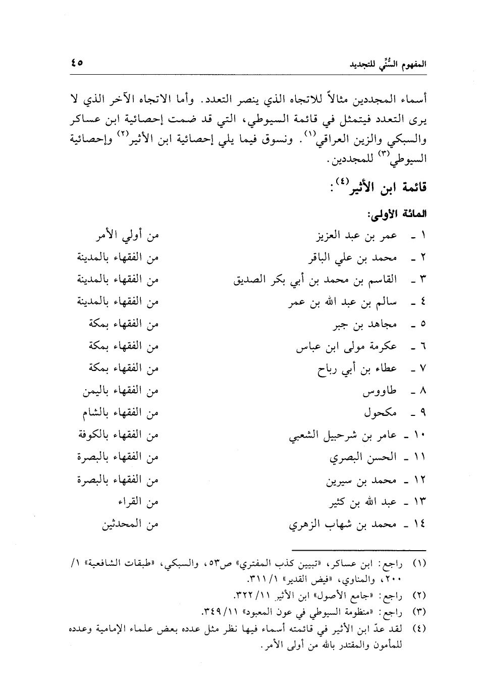 أسماء المجددين مثالًا للاتجاه الذي ينصر التعدد. وأما الاتجاه الآخر الذي لا يرى التعدد فيتمثل في قائمة السيوطي، التي قد ضمت إحصائية ابن عساكر والسبكي والزين العراقي (¬1). ونسوق فيما يلي إحصائية ابن الأثير (¬2) وإحصائية السيوطي (¬3) للمجددين.