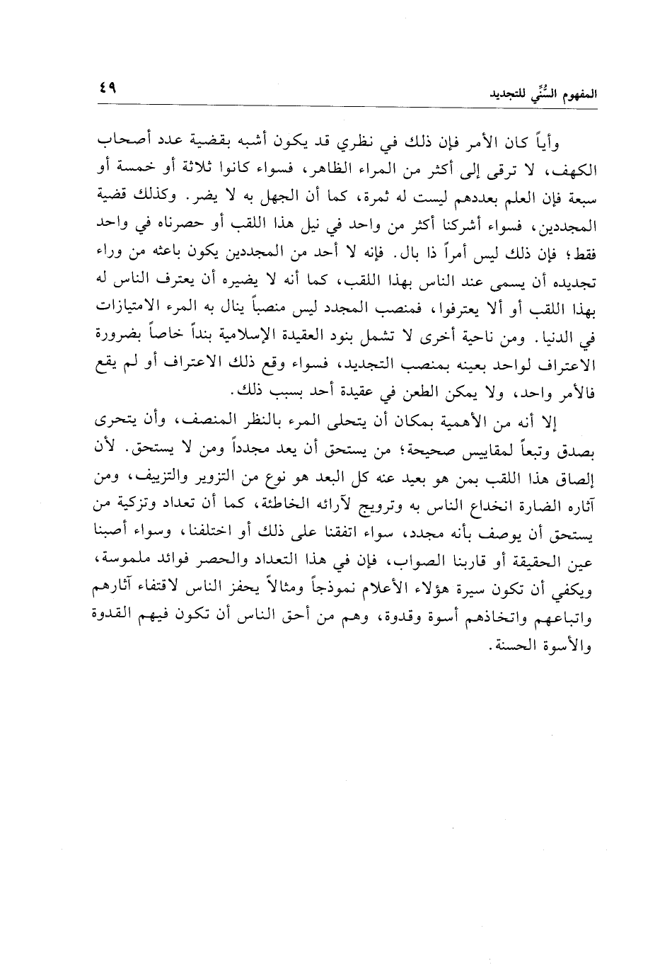 وأيًا كان الأمر فإن ذلك في نظري قد يكون أشبه بقضية عدد أصحاب الكهف، لا ترقى إلى أكثر من المراء الظاهر، فسواء كانوا ثلاثة أو خمسة أو سبعة فإن العلم بعددهم ليست له ثمرة، كما أن الجهل به لا يضر. وكذلك قضية المجددين، فسواء أشركنا أكثر من واحد في نيل هذا اللقب أو حصرناه في واحد فقط؛ فإن ذلك ليس أمرًا ذا بال. فإنه لا أحد من المجددين يكون باعثه من وراء تجديده أن يسمى عند الناس بهذا اللقب، كما أنه لا يضيره أن يعترف الناس له بهذا اللقب أو ألا يعترفوا، فمنصب المجدد ليس منصبًا ينال به المرء الامتيازات في الدنيا. ومن ناحية أخرى لا تشمل بنود العقيدة الإسلامية بندًا خاصًا بضرورة الاعتراف لواحد بعينه بمنصب التجديد، فسواء وقع ذلك الاعتراف أو لم يقع فالأمر واحد، ولا يمكن الطعن في عقيدة أحد بسبب ذلك.