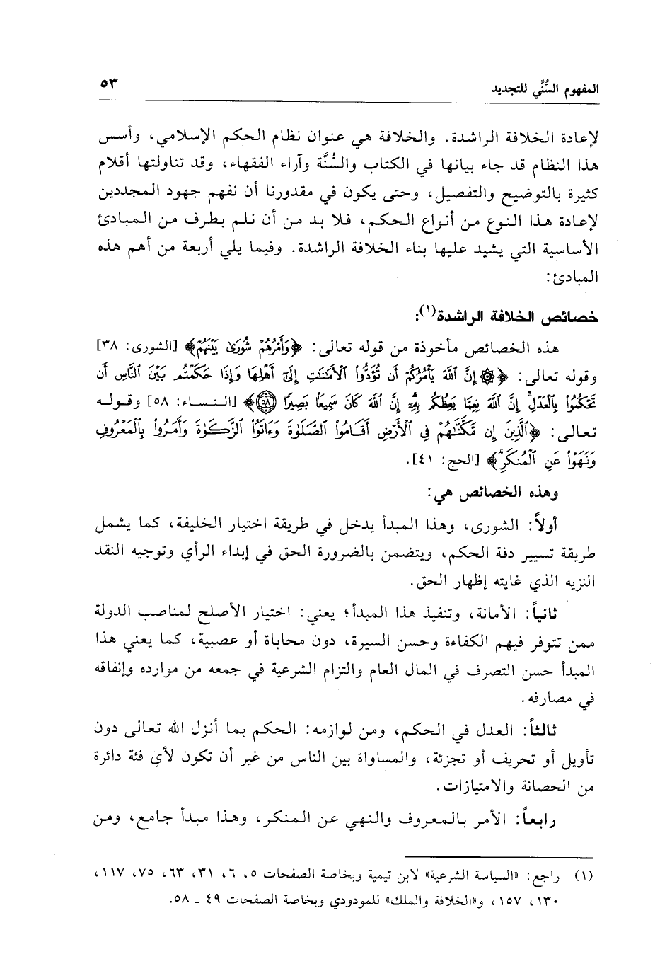(¬1) راجع: "السياسة الشرعية" لابن تيمية وبخاصة الصفحات 5، 6، 31، 63، 75، 117، 130، 157، و"الخلافة والملك" للمودودي وبخاصة الصفحات 49 - 58.